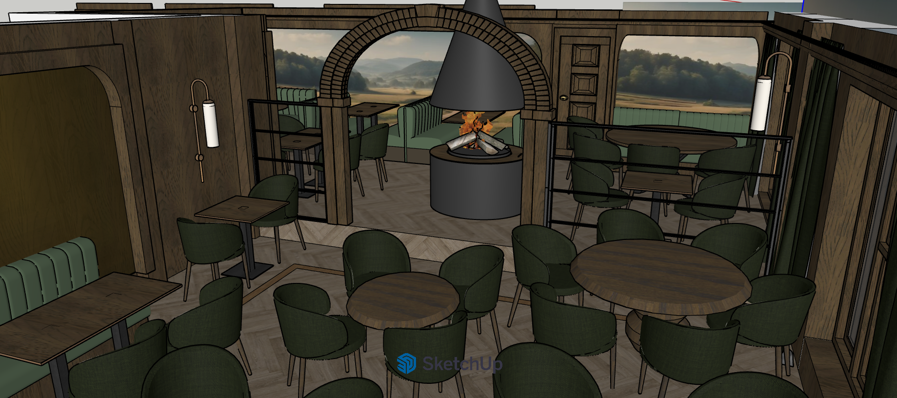 photographic image of restaurant back wall is a mural and right wall has large curtains windows and curtains