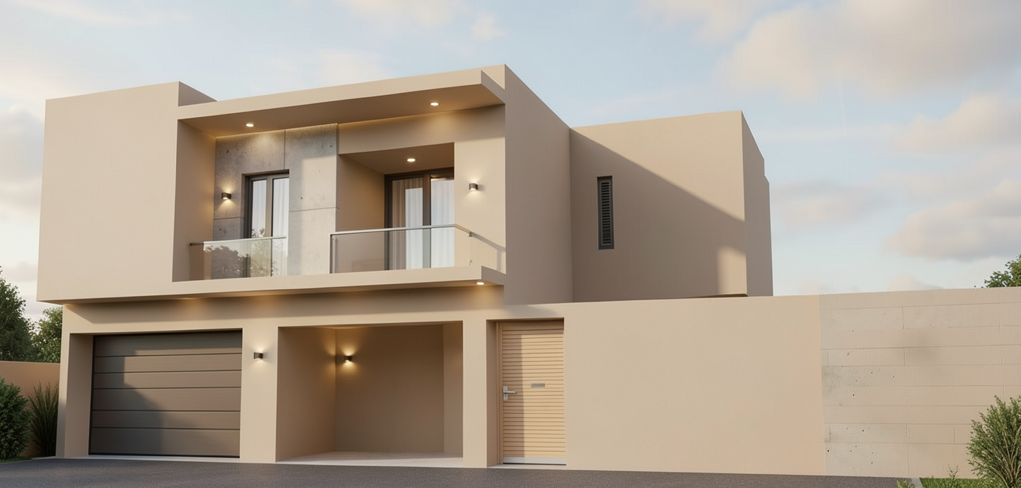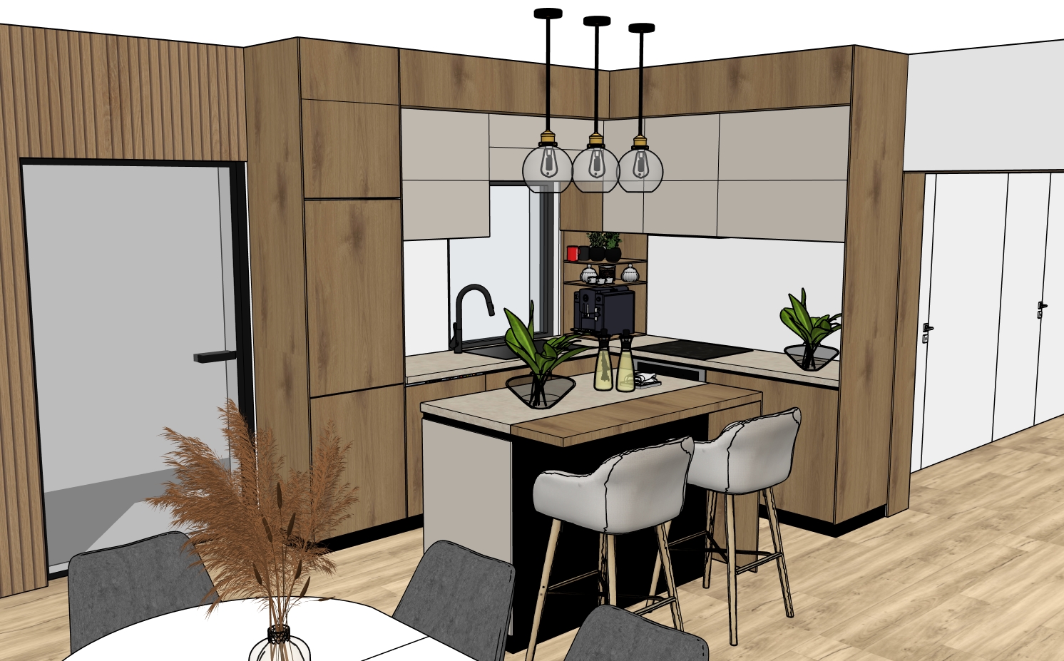 craft a modern kitchen interior featuring warm wooden cabinets and a sleek minimalist design incorporate neutral tones of soft beige and creamy white on the walls include a kitchen island with a part wooden part beige stone countertop and elegant black and white bar stools highlight large glass pendant lights above the island giving a warm inviting glow add green indoor plants for a touch of nature placed on the counter and shelves use a light wooden floor to harmonize with the overall earthy tones set an atmosphere of cozy minimalist sophistication with soft natural light streaming through a window reflecting a calming and warm ambiance