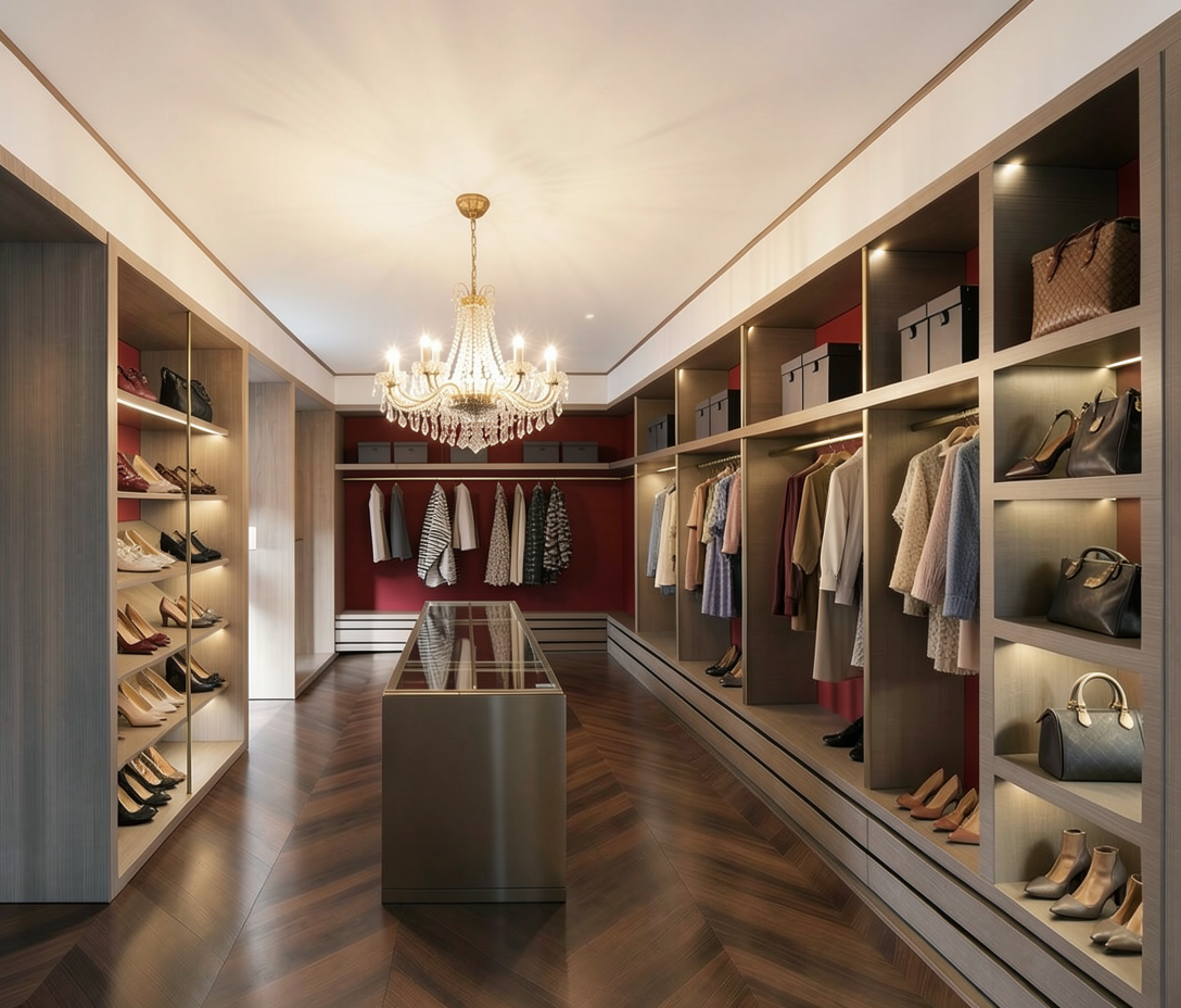 add a few more shoes on the left shelves a few more women bags on the right shelves keep the clothes as they are