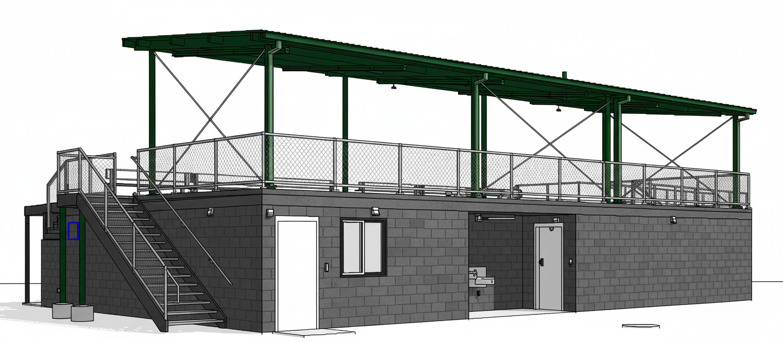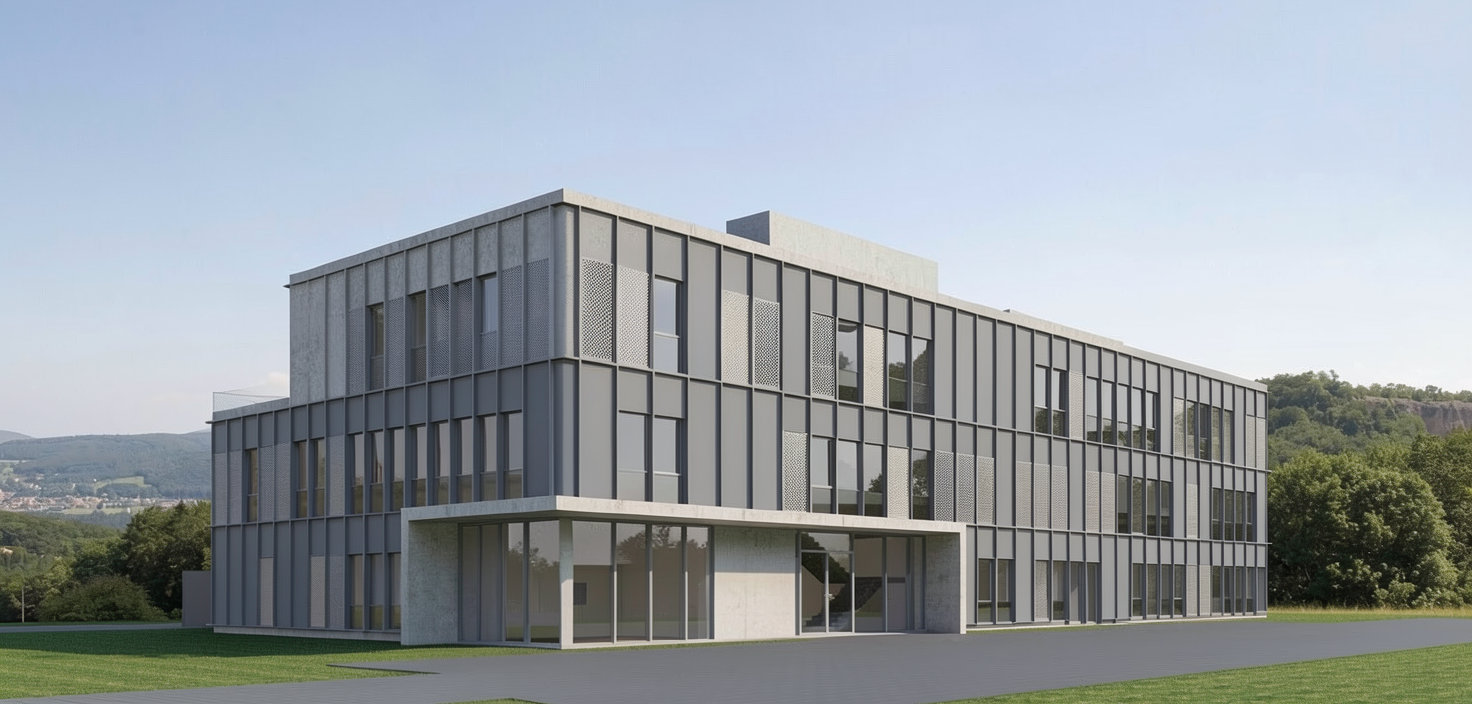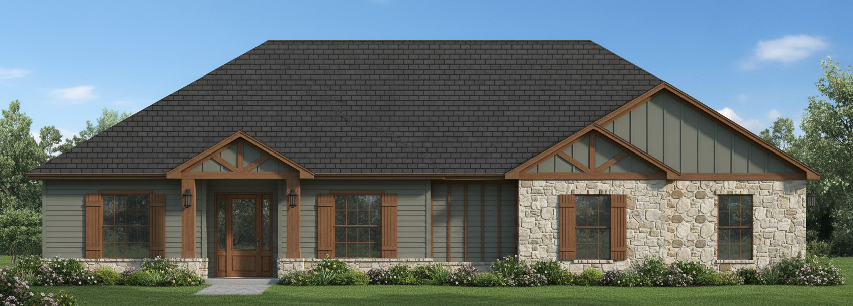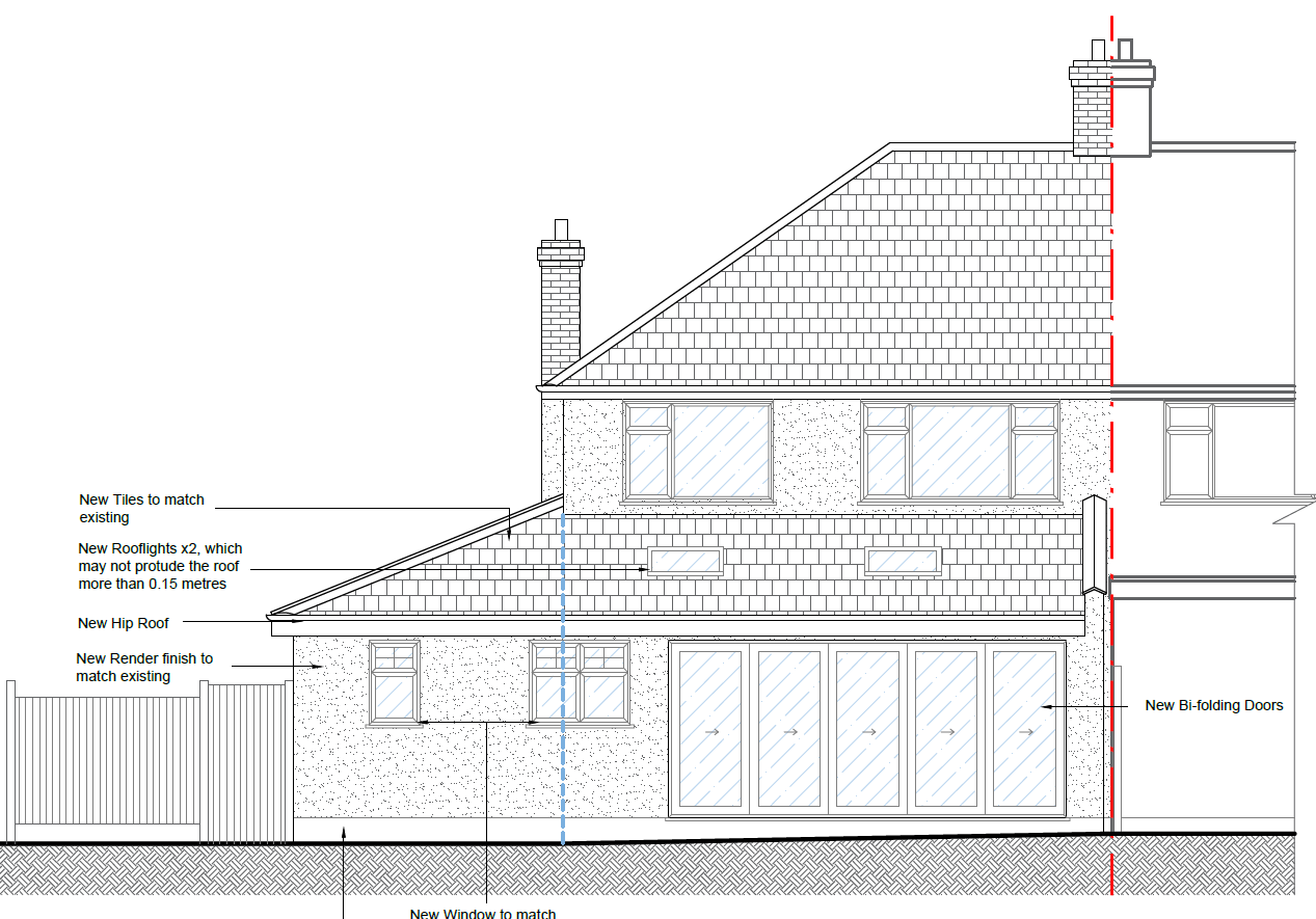 create a high quality architectural elevation render based exactly on the uploaded elevation drawing important maintain elevation view very slight depth only do not redesign or alter proportions follow window positions exactly keep overall composition identical to the drawing style soft 3d depth not flat 2d not full perspective warm natural daylight from left side realistic shadow under eaves and window reveals slight depth to window frames and sills clean light blue sky background simple neutral ground plane no text no dimensions no boundary lines materials existing walls light beige pebble dash texture extension smooth warm off white render roof tiles dark grey slate concrete tile all windows anthracite grey aluminium bi fold doors anthracite grey aluminium fascia and soffits white gutters black subtle internal reflection in glazing not transparent lighting late afternoon soft sunlight warm highlights natural realistic shadows no dramatic hdr lighting this should feel like a professional uk residential planning presentation render not ultra modern and not stylised cgi