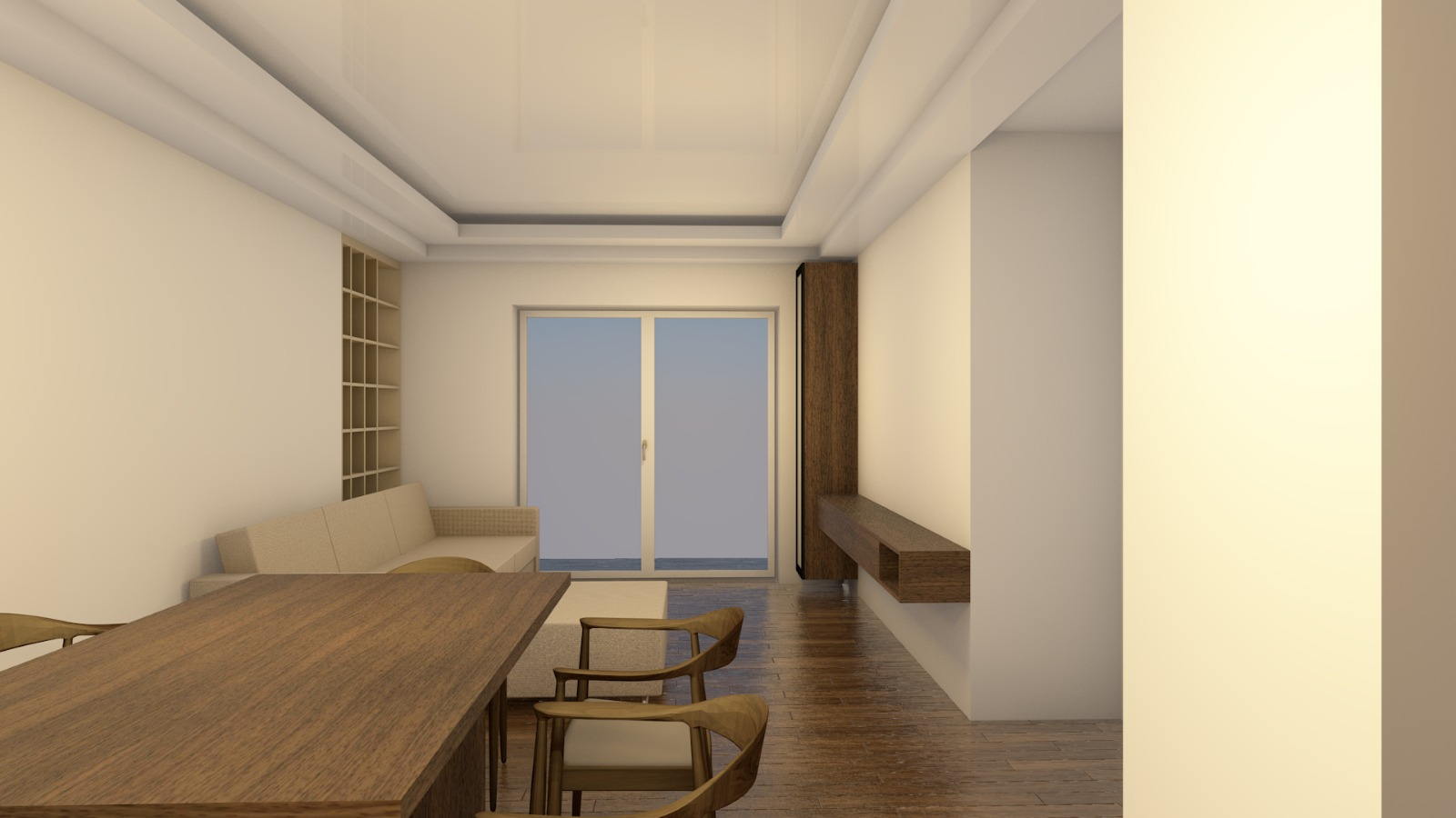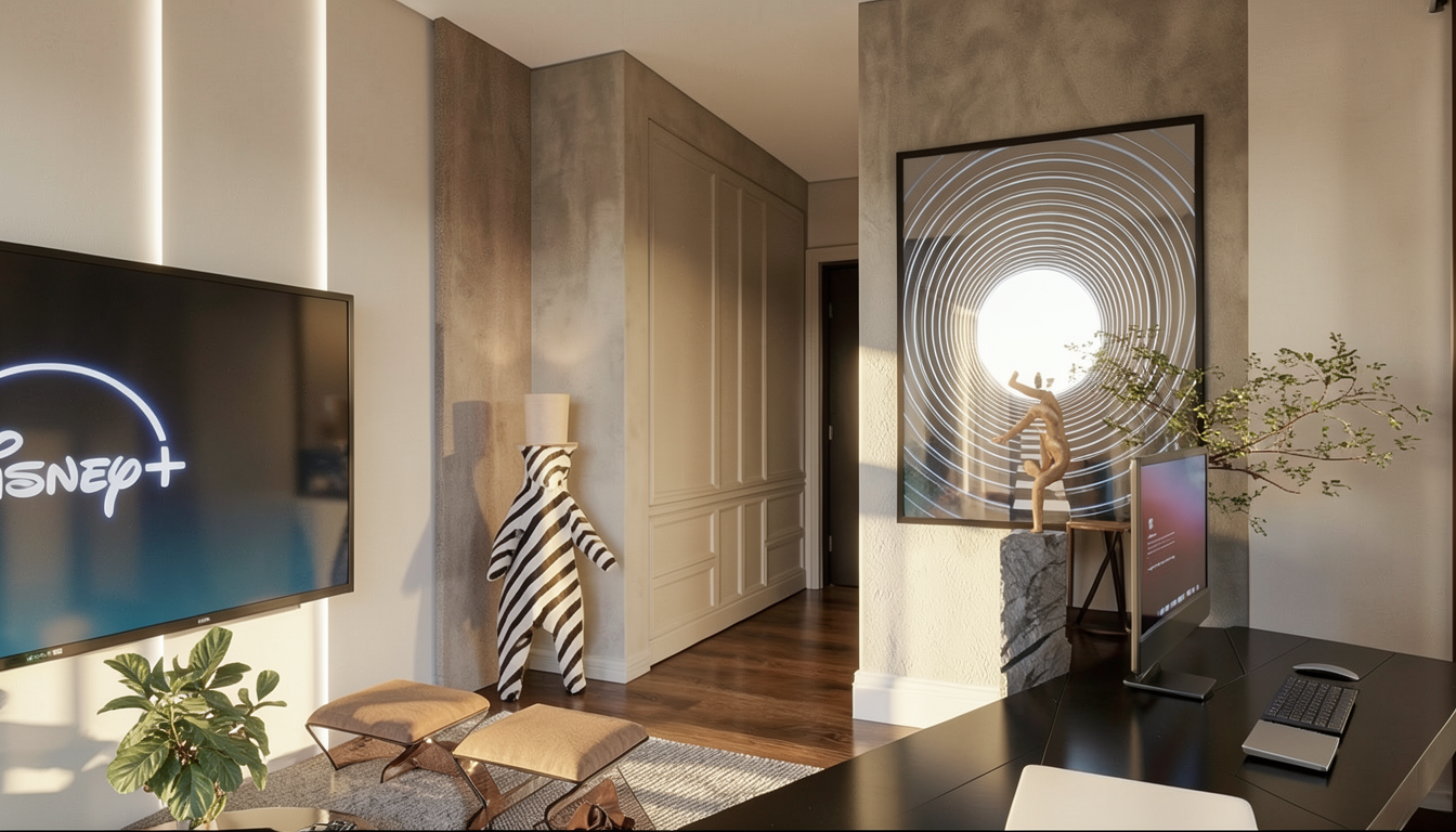 a warm and inviting living room with a beige l shaped sofa add soft pillows in neutral tones beige cream light brown behind the sofa include modern decorative shelves with books vases candles and minimal art objects the tv wall should feature a walnut tv unit add a cozy rug that complements the palette and a modern coffee table wood or stone finish include small decor elements like candles trays and plants to enhance warmth and realism