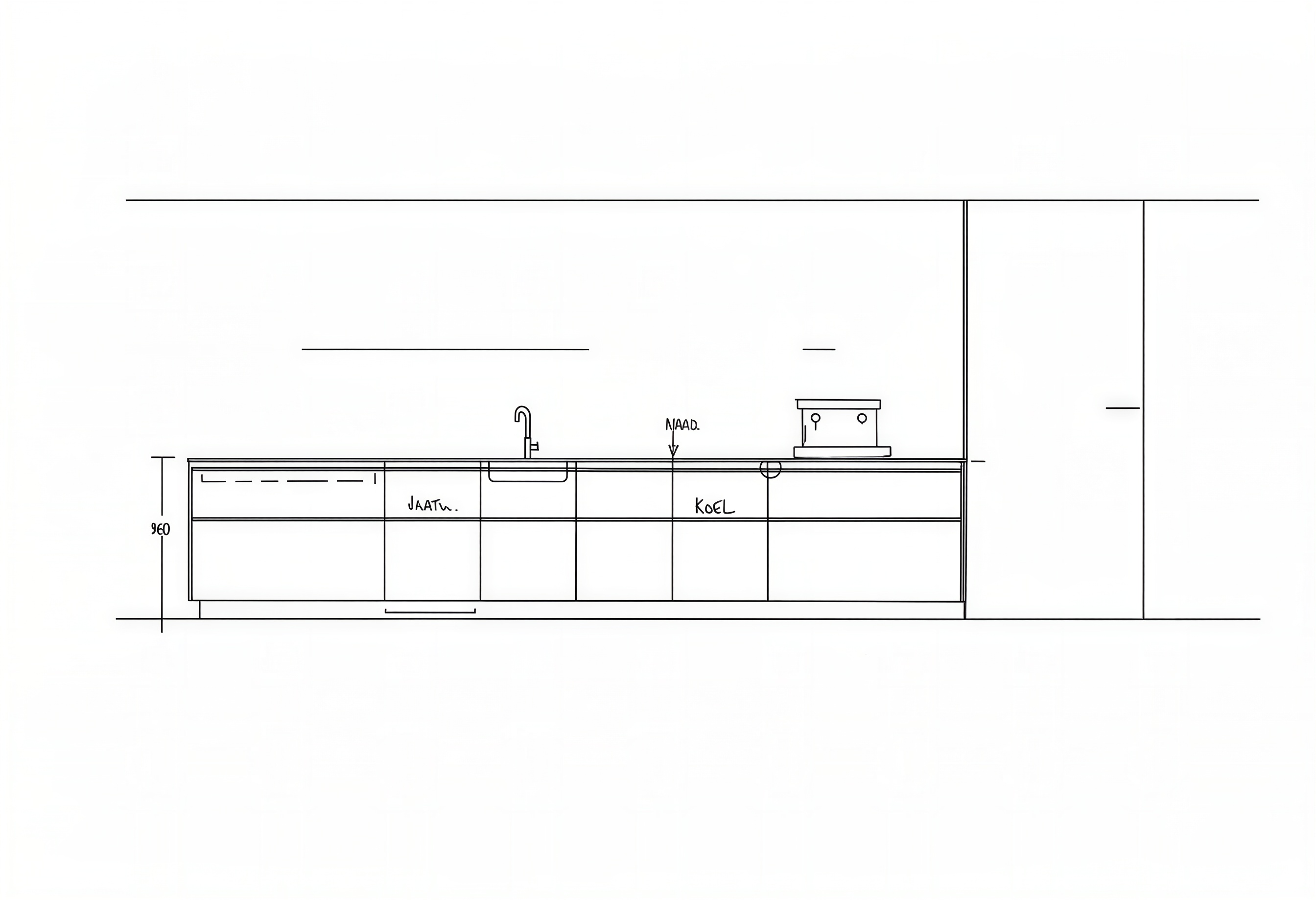 convert this hand drawn kitchen elevation sketch into a clean professional a3 presentation sheet that looks like it was precisely drafted in autocad preserve the exact kitchen design geometry proportions and layout from the original sketch do not redesign reinterpret or modify the kitchen the drawing must remain faithful to the original sketch transform the sketch into clean architectural cad style linework sharp precise black lines consistent architectural line weights crisp technical drafting style similar to autocad clear and professional architectural drawing quality remove all logos branding and watermarks arrange the elevations neatly on a minimal and elegant a3 presentation layout with balanced spacing and margins similar to professional architectural presentation sheets apply subtle color to the drawing while keeping the technical drawing style kitchen fronts finished in natural walnut wood with a warm tone and subtle wood grain countertop in a light composite stone color soft neutral tone keep the coloring refined and architectural not overly photorealistic maintain the clean cad drawing appearance use a white background and minimal presentation style suitable for a high end interior design presentation the final result should look like a professional architectural kitchen drawing sheet created in autocad with subtle material indication