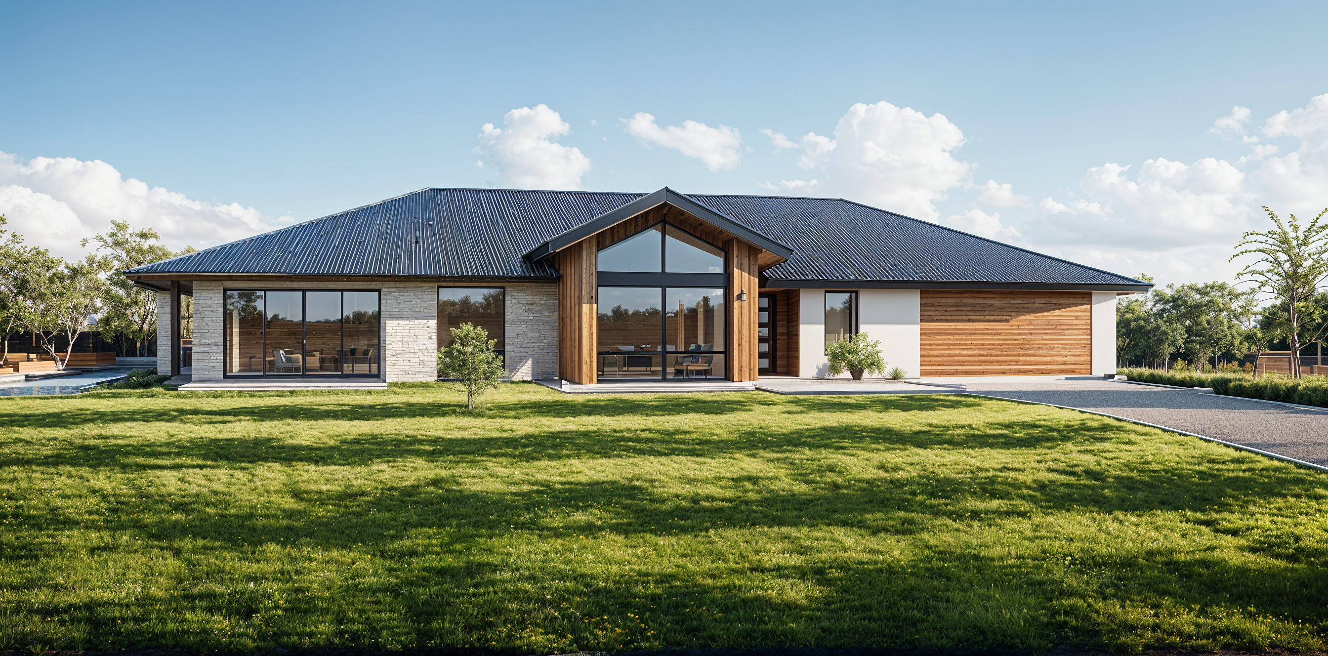 minimal landscaping mainly flat grass to front bright reflective glass steel roof