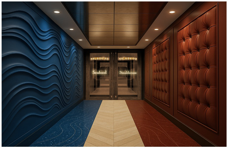 minimalism night shot design an entry way to a restaurant split in two design one side is for seafood and the other side for steakhouse architecture