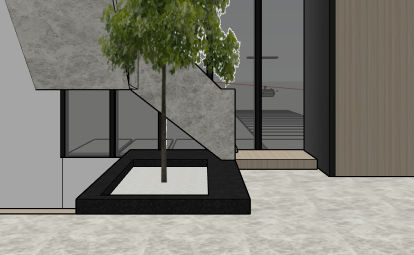 a modern architectural exterior featuring a sleek concrete staircase and a lush green tree the building facade is smooth light gray with large reflective glass windows the tree stands in a minimalist planter with a dark charcoal base and soft white gravel the ground is textured stone in a light cream color add an atmosphere that is calm and serene bathed in the soft glow of a cloudy day