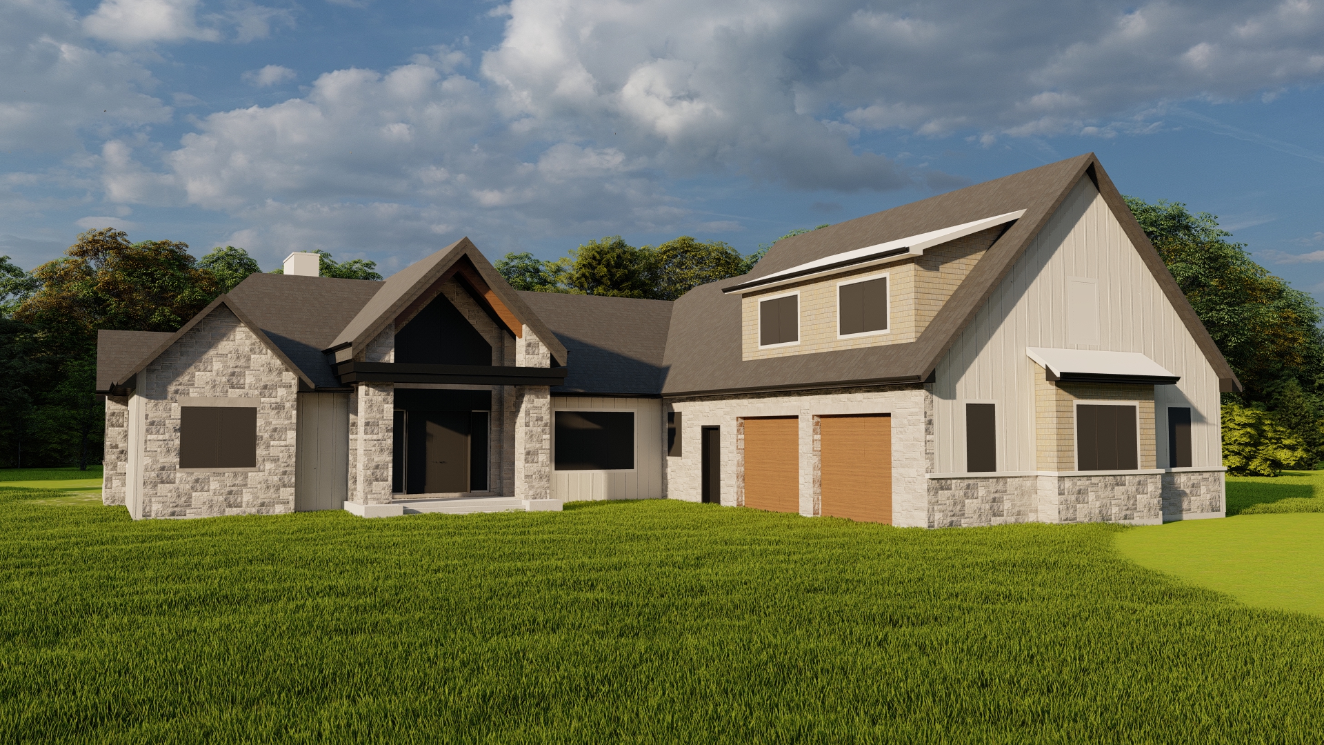 add driveway to the garage doors and walkway to the porch add glass to the windows