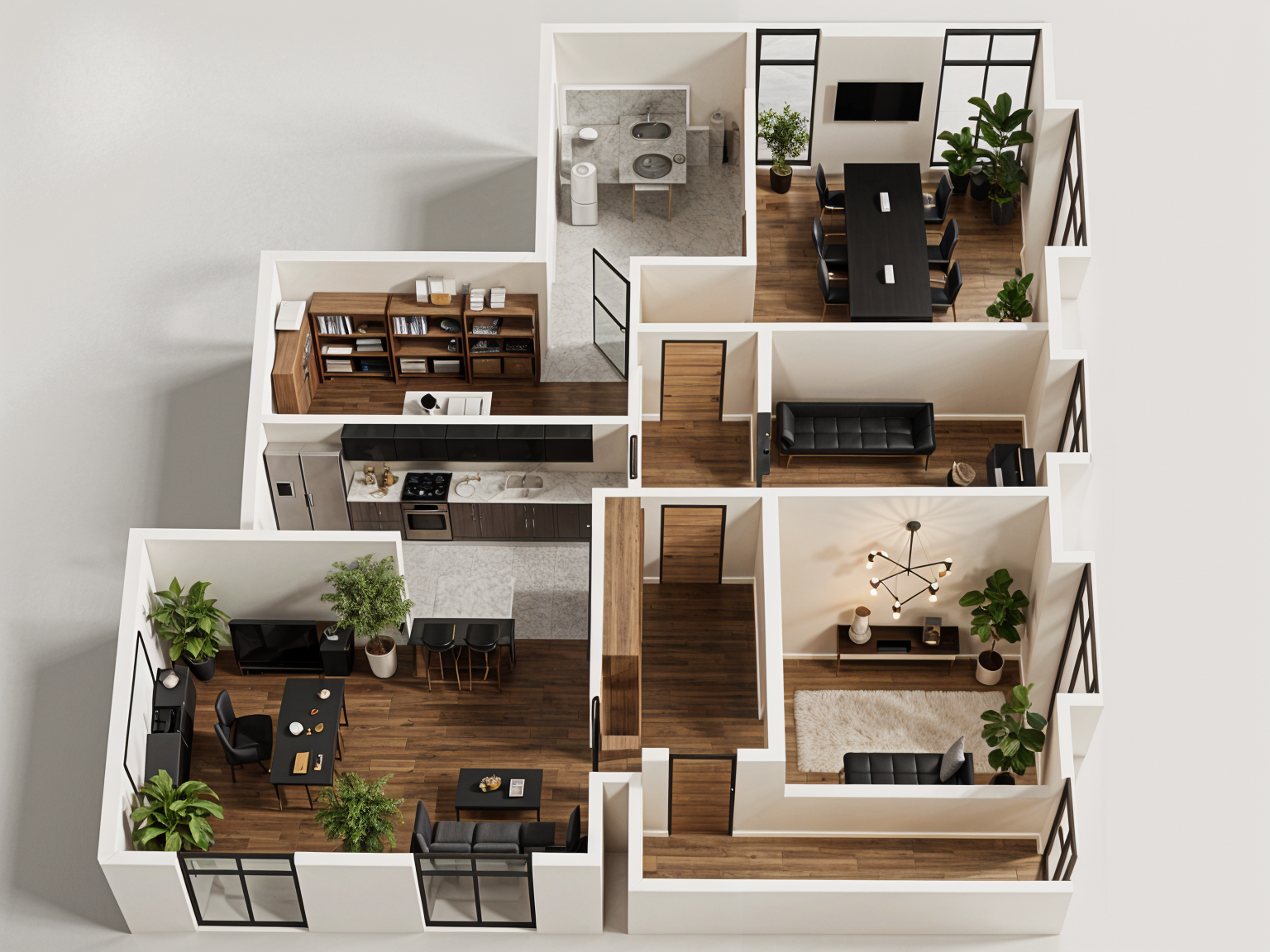 interior perspective of a new build modern luxury home maintain exact floor plan layout open concept layout white painted walls light oak hardwood floors marble kitchen countertops large kitchen island clean stainless steel appliances modern luxury furniture neutral color palette bright natural daylight entering through large windows soft shadows clean lines minimal aesthetic realistic materials architectural visualization eye level interior view modern residential interior
