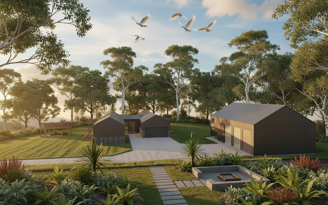 a manicured lawn in garden beds low maintenance native australian tall ferns and shrubs two small xanthorrhoea genus two small grass trees many large australian eucalyptus trees tall snow gums and tall stringybark trees to background and foreground straight linear stone pathway leading to the entrance of a small square fire pit with seating to the left rear of site a flying flock of white cockatoos a small isuzu d max truck