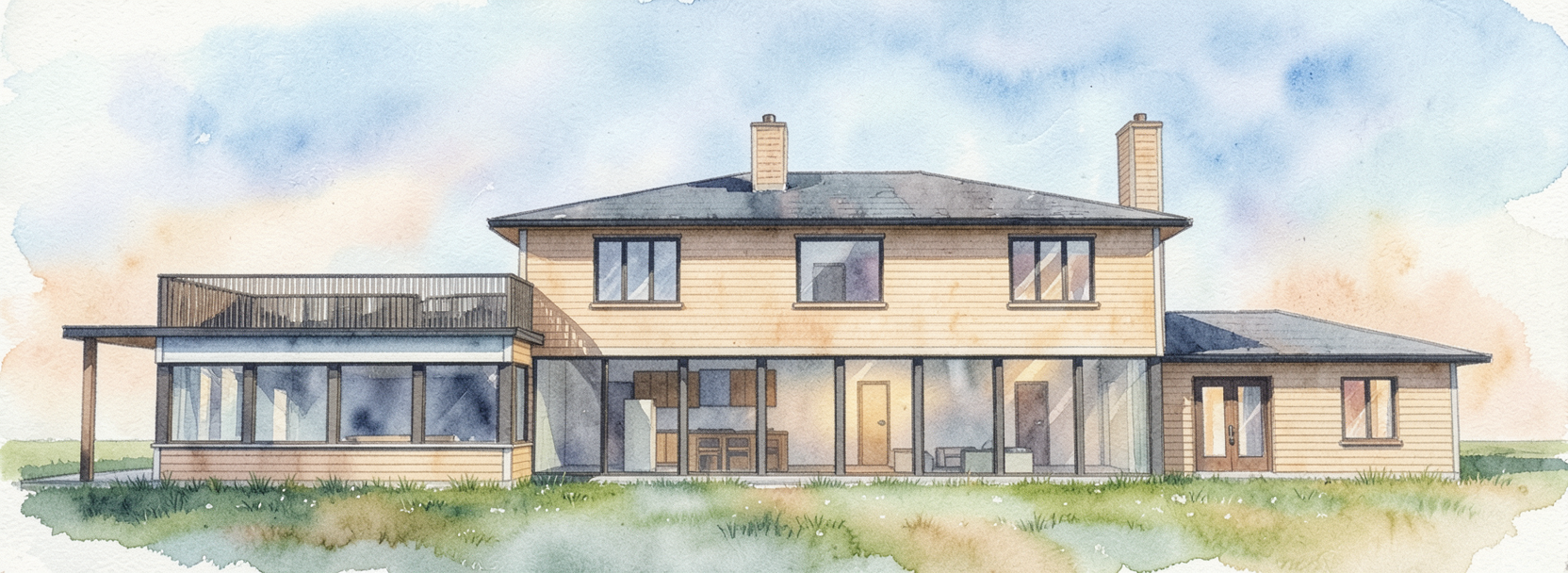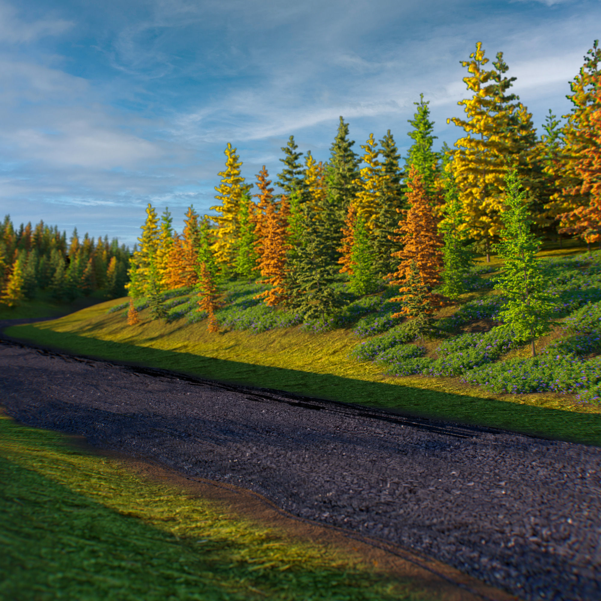 a vibrant landscape with a clear blue sky scattered with soft white clouds lush green and golden deciduous trees are interspersed with deep green pine trees creating an autumnal palette the sun casts a warm glow highlighting shades of bright green orange and yellow on the trees below a rail ballast ground contrasts with the verdant grass and wildflowers on its edges the peaceful atmosphere is enhanced by the gentle play of light and shadows evoking a sense of serene tranquility