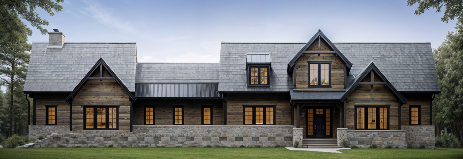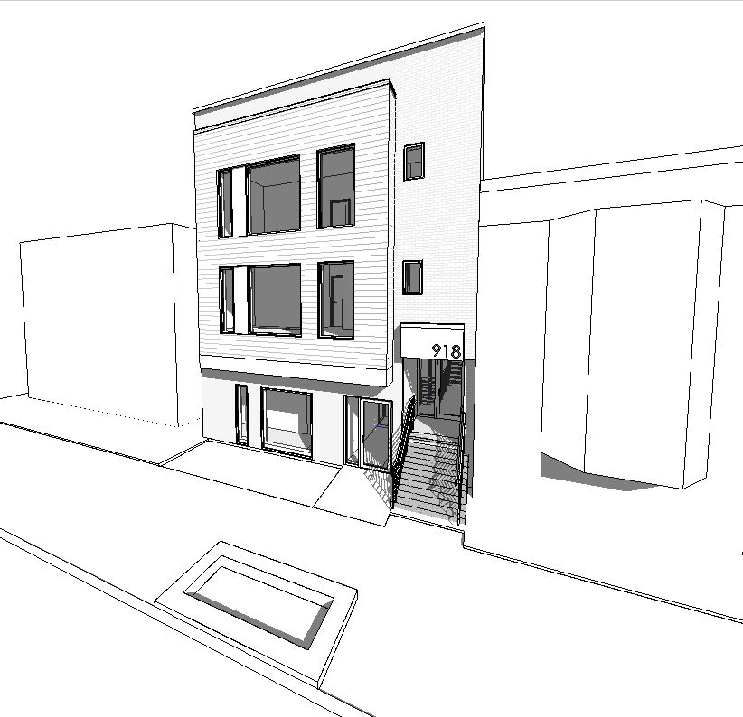 modernist exterior shot middle building has a dark grey brick facade the bump out has warm horizontal wood plank siding the windows have black frames the address is 918 westside ave jersey city nj 07306 architecture