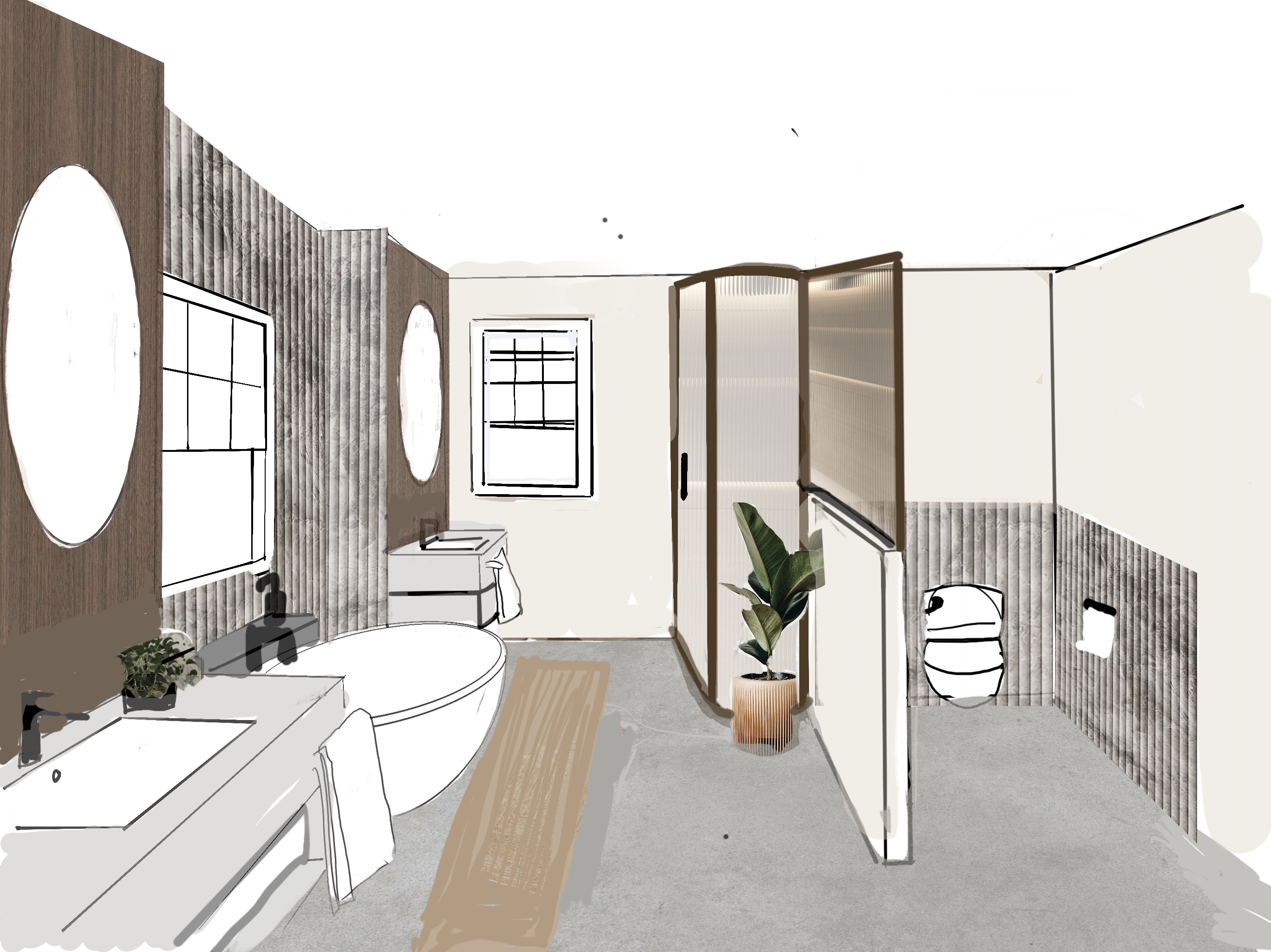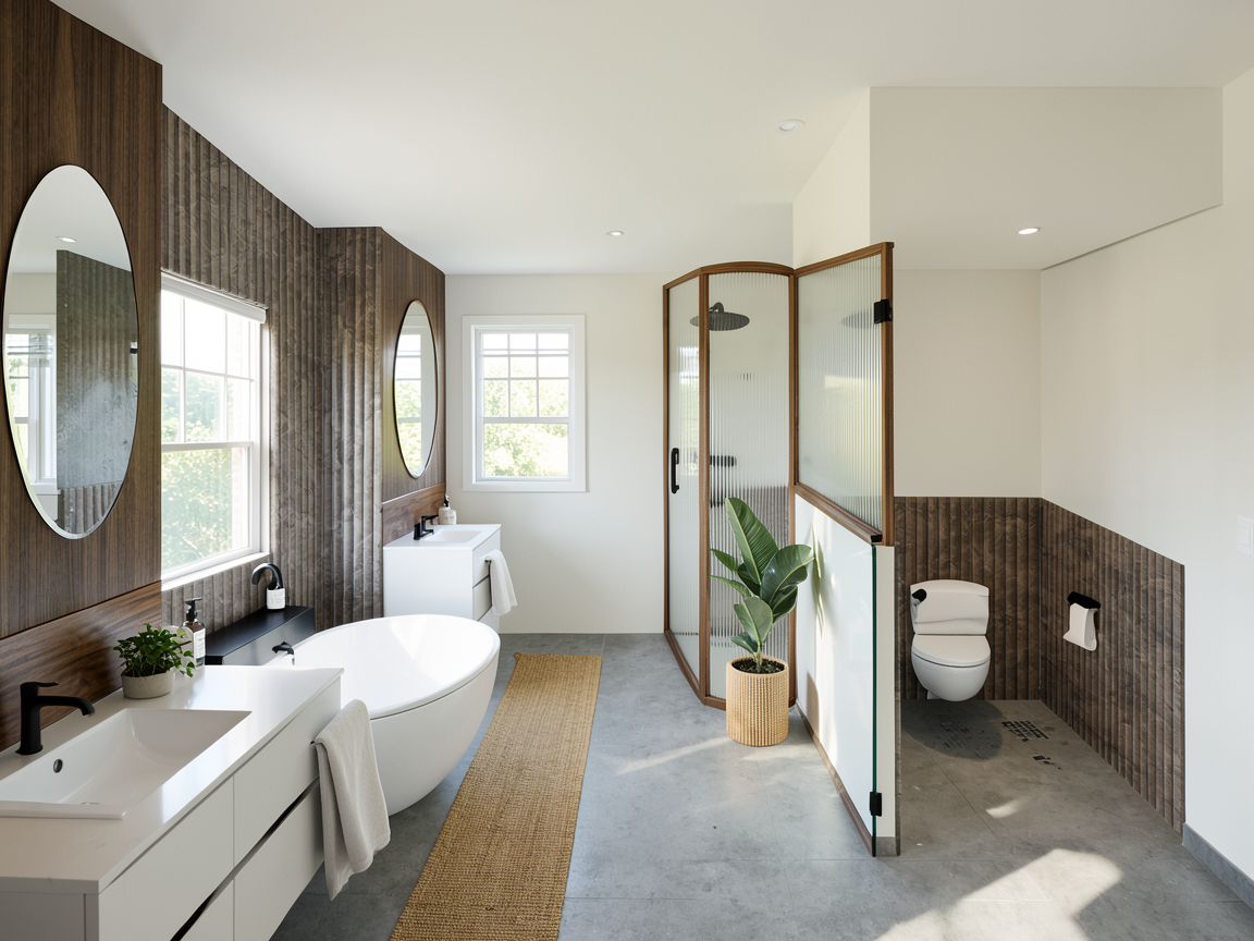walnut wall behind sinks fluted stone behind bathtub and toilet grey marble