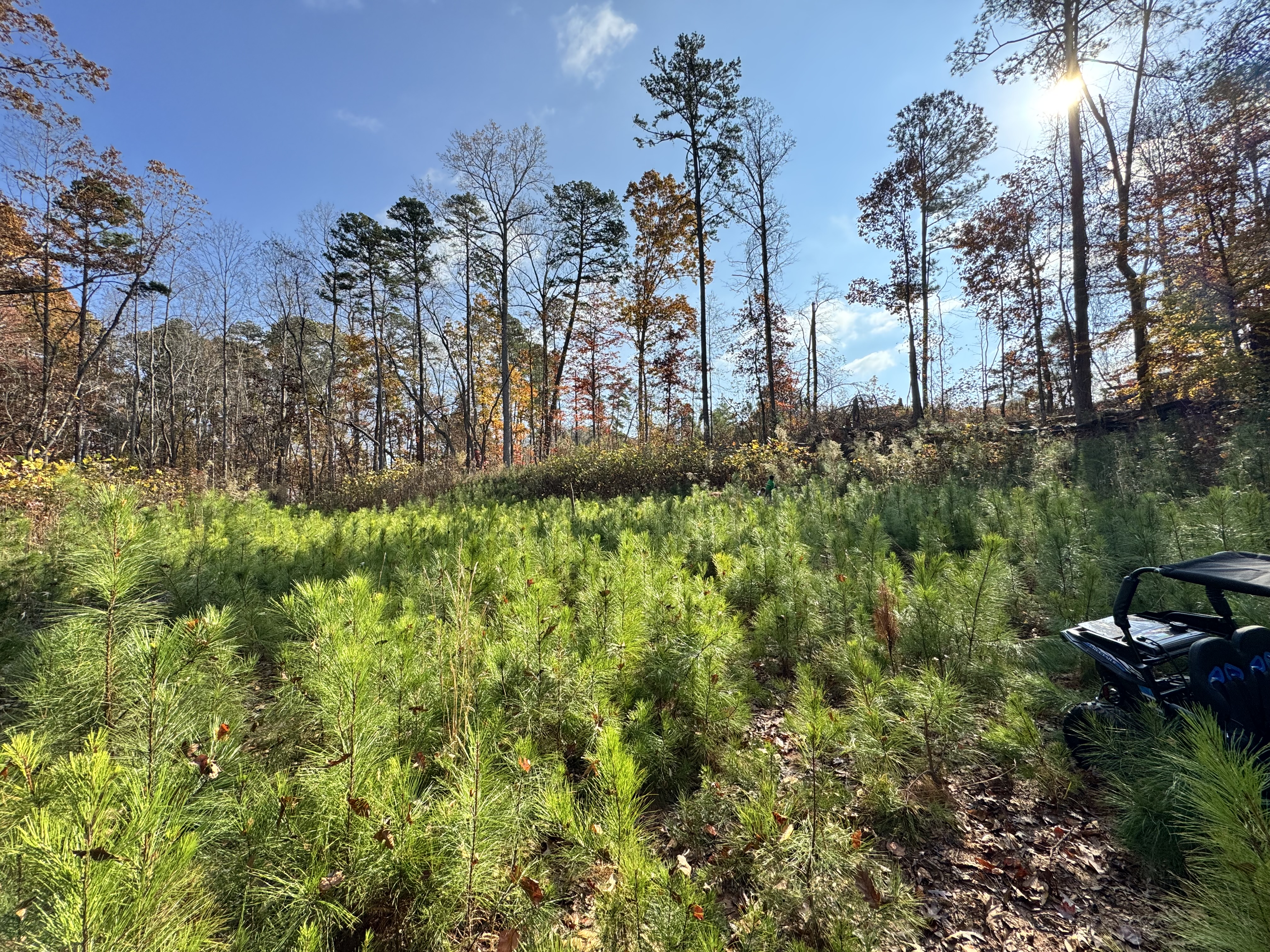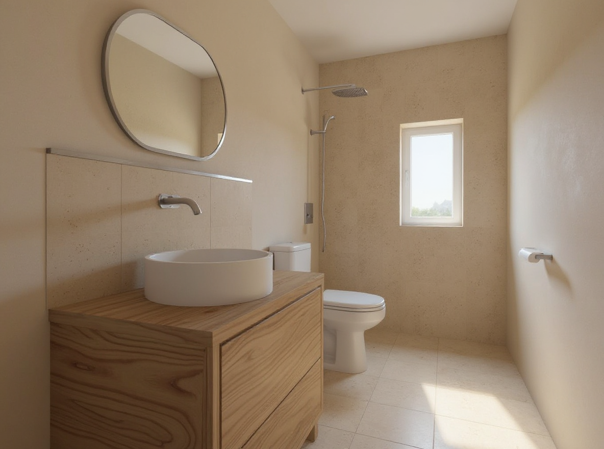 render this land with a medium sized greenhouse centered to the rear of the plot with rows of raised garden beds around it small gravel between the garden beds the greenhouse to have a 3 ft white brick water table architecture