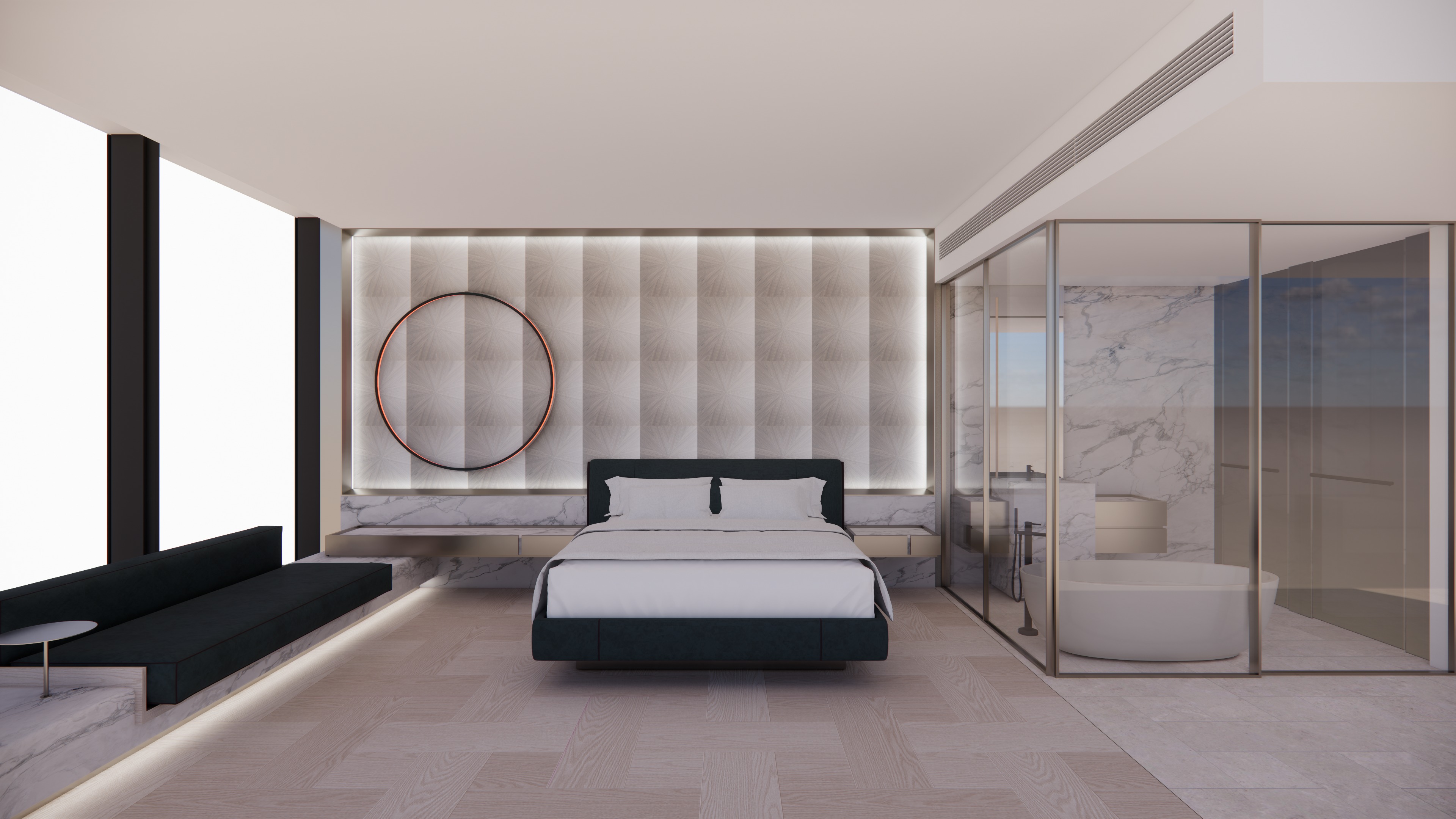 enhance overall material realism and lighting quality ensure all table lamps are switched on and properly illuminated to brighten the space this is a luxury hotel room design maintain the original furniture lamp selection layout and camera angle without any changes do not replace or reinterpret any existing materials or finishes set the lighting atmosphere to approximately 3000 lux to create a warm comfortable and luxurious mood ensure the space feels softly illuminated refined and high end add a tasteful warm rug beneath the bed to enhance comfort and luxury enhance realism through accurate textures reflections shadows and balanced lighting only produce a clean professional photorealistic luxury hotel interior render