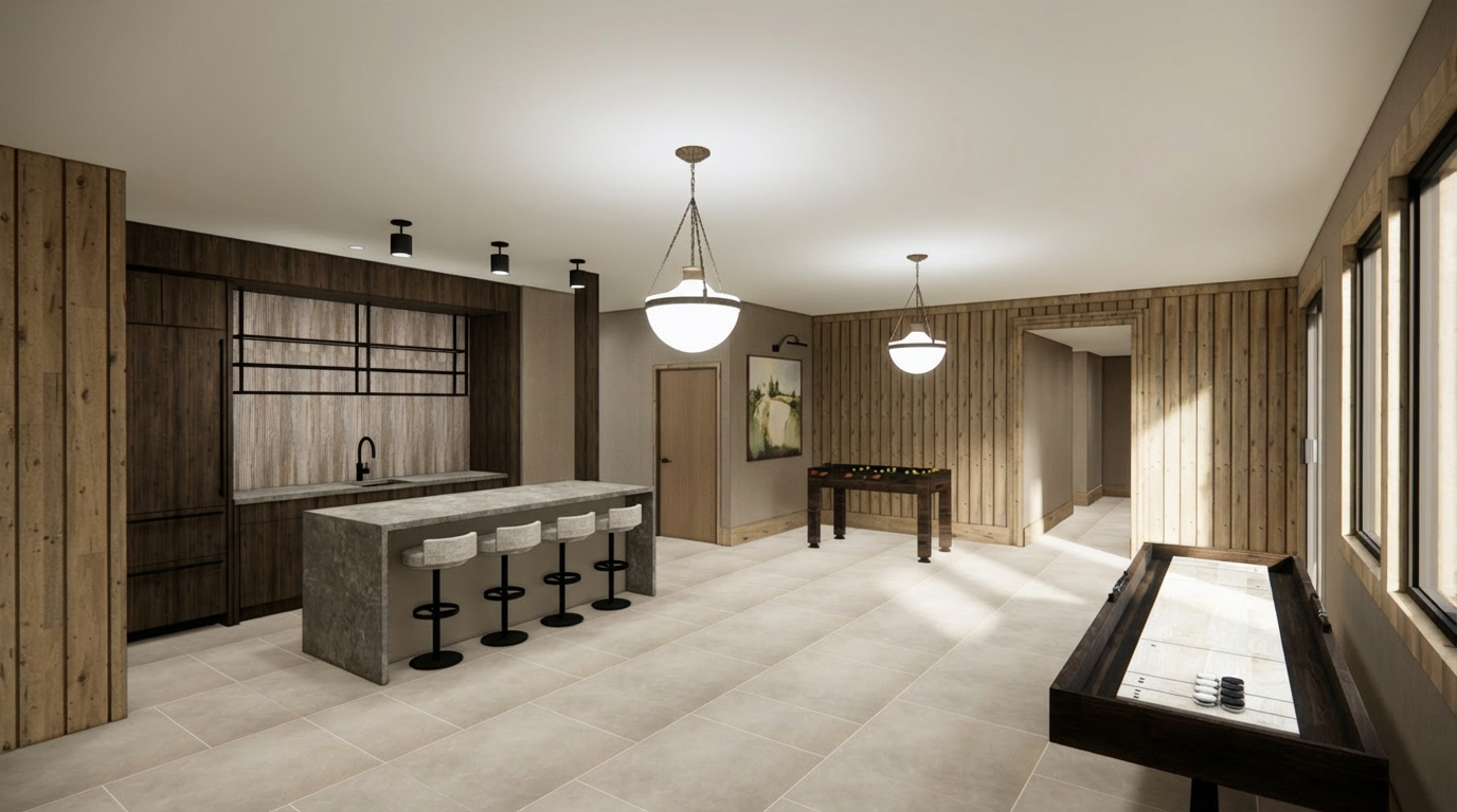 photorealistic rendering of the provided kitchen model preserve the exact architecture layout cabinetry design beam placement stone layout door and window locations and camera angle do not add remove or reinterpret any built elements the wood door to the left of the range must remain a solid wood door do not replace or modify it into a window target mood slightly moodier warm high end european country house collected lived in with depth and character not dark not bright not flat not new build lighting soft low ambient daylight entering from existing windows with gentle falloff warm interior lighting 2700k 3000k subtle and layered overall exposure slightly dimmer than neutral with richer shadows and midtone depth no harsh contrast no spotlighting no overexposure no black voids under cabinet lighting very soft and minimal just enough to lift shadows glass cabinets softly backlit with a dim warm glow pendant lights dim and warm contributing to atmosphere not dominant materials stone natural limestone with creamy warm variation irregular edges and visible depth in joints matte chalky aged surface avoid uniformity and avoid clean or modern appearance countertops maintain exact color and material honed finish with very low reflectivity no gloss no bright highlights wood all wood elements to feel aged character rich and slightly worn visible grain variation knots tonal shifts subtle imperfections matte hand finished appearance island wood slightly deeper and richer in tone than perimeter cabinetry beams keep exact placement render as reclaimed hand hewn white oak with visible tool marks cracks and irregular edges warm aged tone matte finish cabinetry painted cabinetry in a warm muted neutral soft cream stone no green or gray cast subtle depth and shadowing at panel edges matte finish no sheen lived in character subtle refined introduce light styling that enhances realism without clutter a few ceramic vessels or wood pieces on countertops a simple linen or small rug on the floor minimal curated accessories only everything should feel intentional not staged or busy atmosphere soft ambient occlusion at corners under cabinetry and where materials meet slightly deeper shadows to create mood while maintaining visibility balanced warm midtones with gentle highlights avoid any change to doors windows or architecture glossy or reflective finishes flat or uniform materials bright airy or spec home appearance overly dark or overly dramatic lighting maintain exact geometry and perspective
