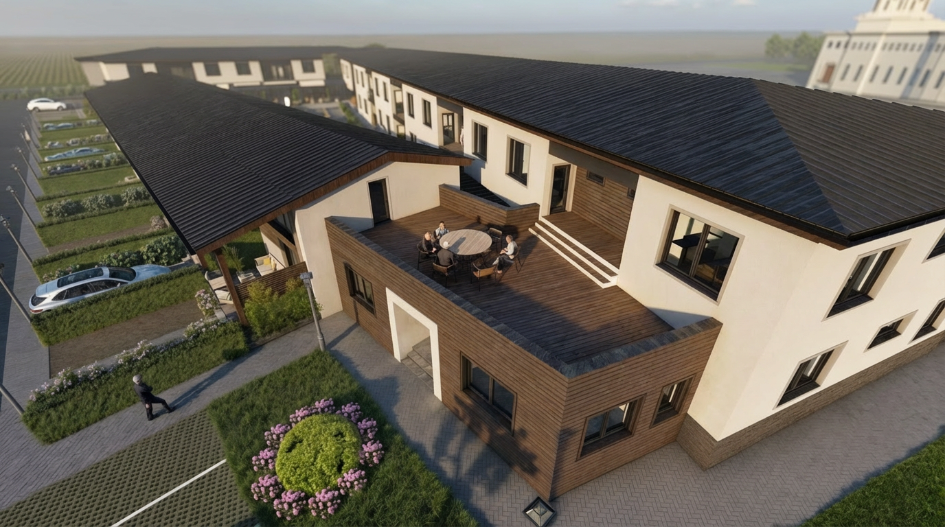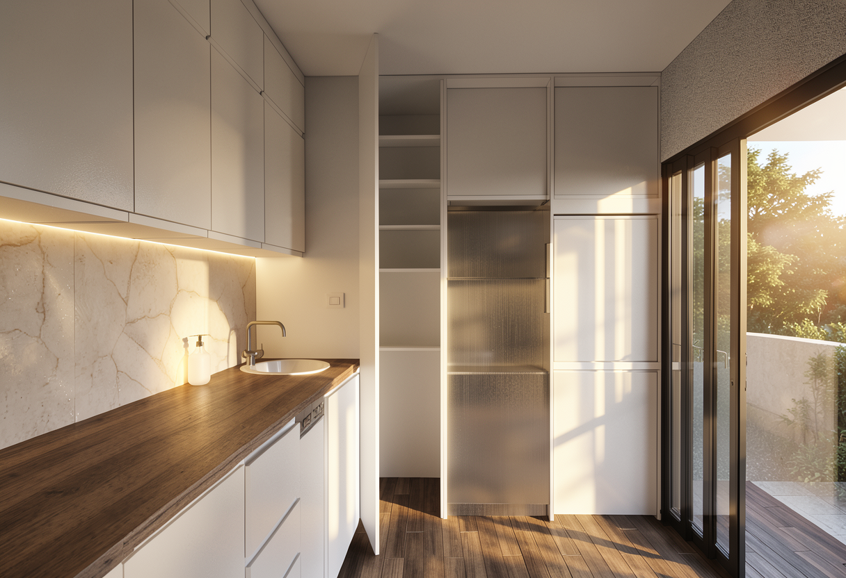 enhanced interior lighting white quartz slab countertop same white quartz slab 6 inch backsplash two porcelain undermount sinks brass deck mount faucets small mosaic limestone tile on floor natural wood white oak cabinetry with brass hardware very light tan plaster on walls wood trim around opening on left with large wood header full width mirror above sinks 3 evenly distributed sconces with one of them centered in ceiling lights in soffit above sinks soft accent lighting underneath the mirror natural wood flooring beyond threshold on left natural wood tall baseboard