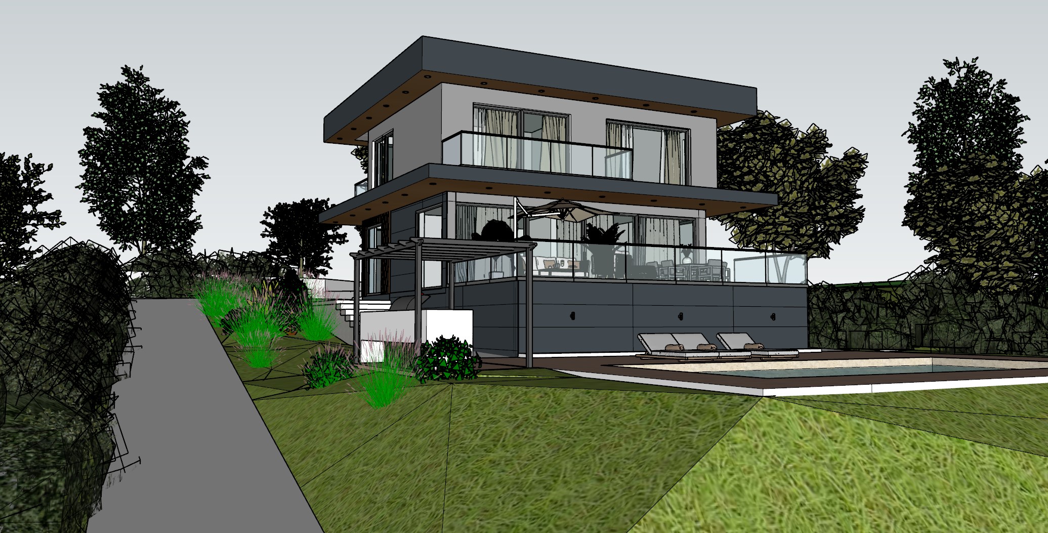 render a modern two story house with large glass windows a sleek flat roof and a spacious balcony the structure is characterized by white and charcoal gray panels with warm wooden accents the outdoor area features a luxurious swimming pool surrounded by polished concrete set against a backdrop of lush greenery vibrant grass and bright green shrubbery line the property while tall dense trees provide a natural and serene atmosphere the sky is a clear pale blue contributing to a peaceful and inviting ambiance capture the elegance of contemporary architecture with a focus on clean lines and a harmonious blend with nature