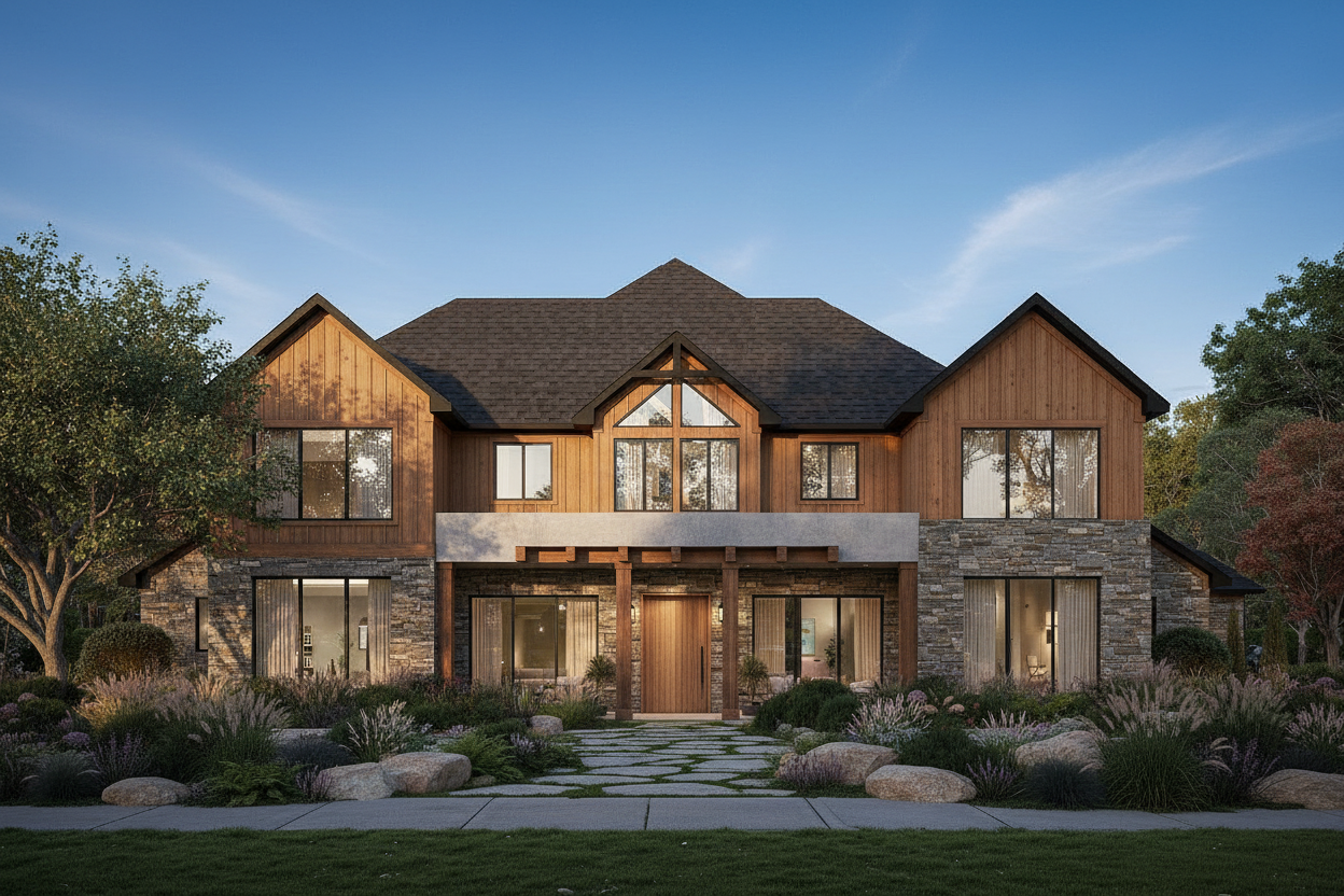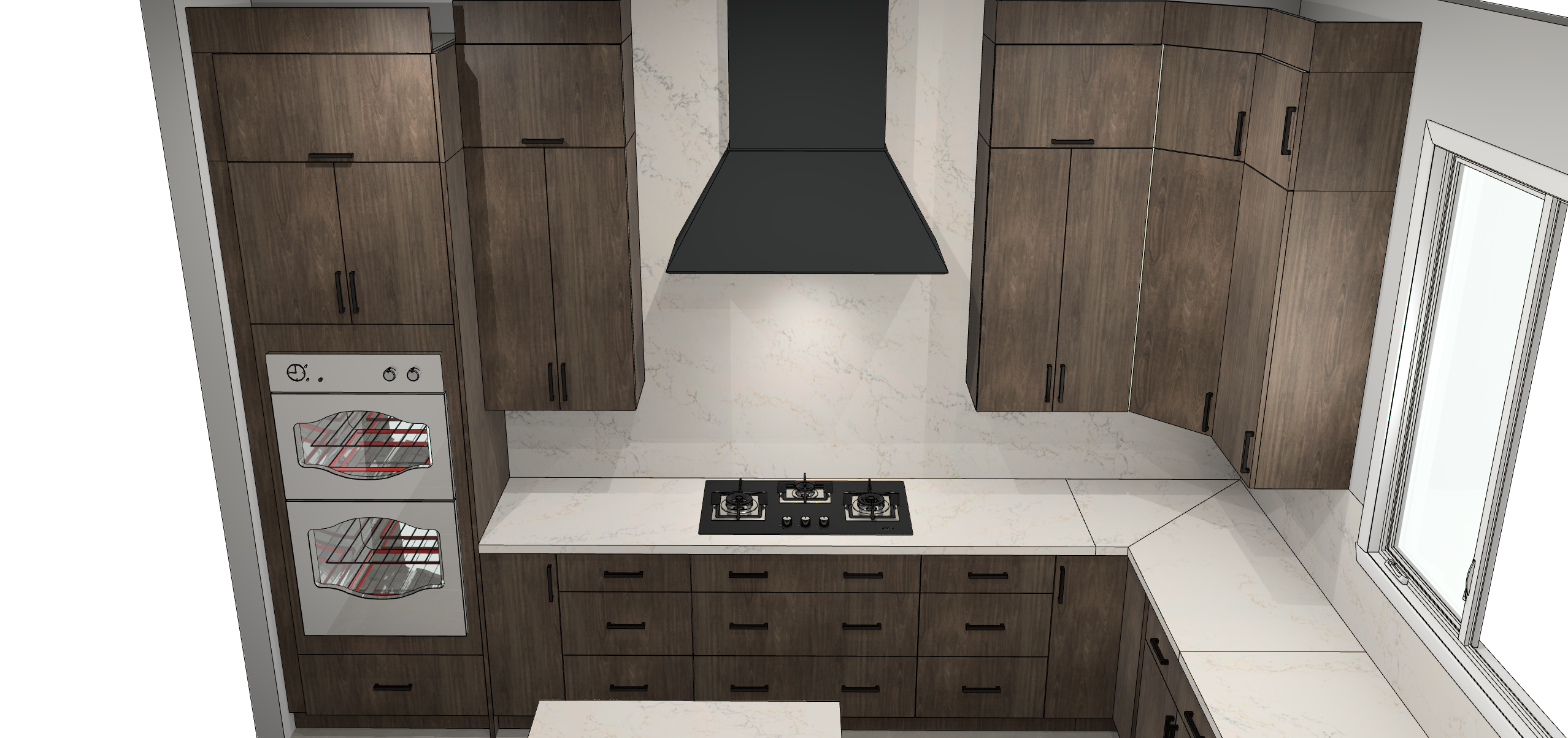 do not alter configuration cabinets are rich walnut color nice minimal veined quartz countertop black hardware modern kitchen realistic render high quality render