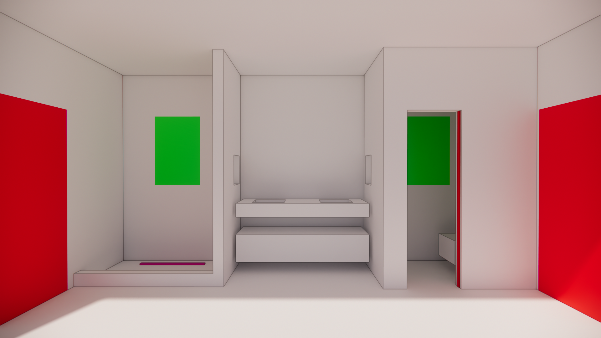 create a white block rendering of this space do not change the layout scale proportions or placement of anything keep all walls openings and elements exactly as shown keep everything white except the highlighted areas windows green the green highlighted areas represent windows replace them with white windows with simple molding trim do not change the size shape or placement put a tress behind the windows doors red the red highlighted areas represent doors replace them with white doors with molding trim the doors on the right and left walls do not change placement do not change the size shape or placement leave everything else as a clean white block model