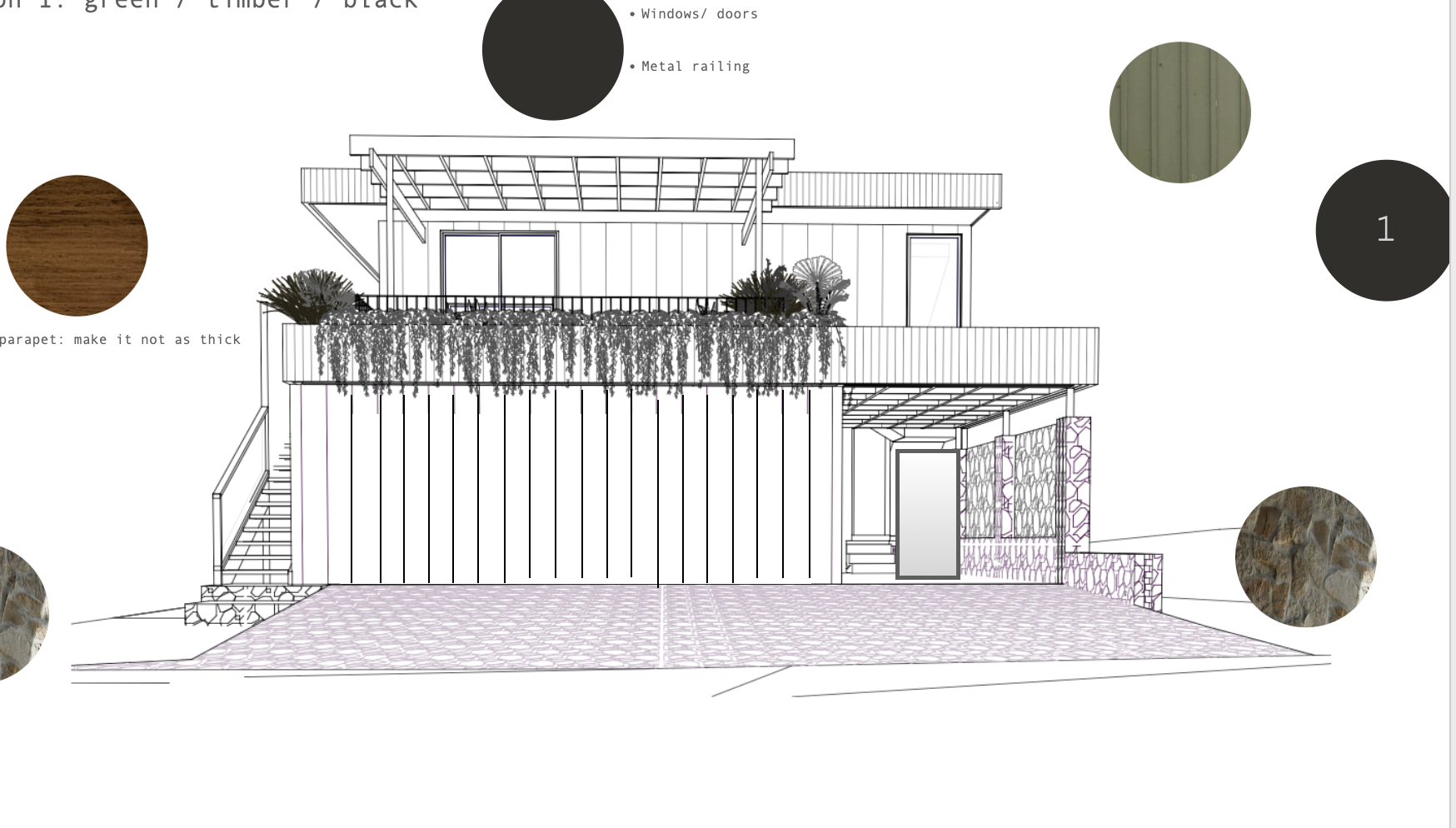 make the green a warm olive green for the cladding parapet should be walnut colour timber metalwork and windows to be charcoal black pergola to be black timber