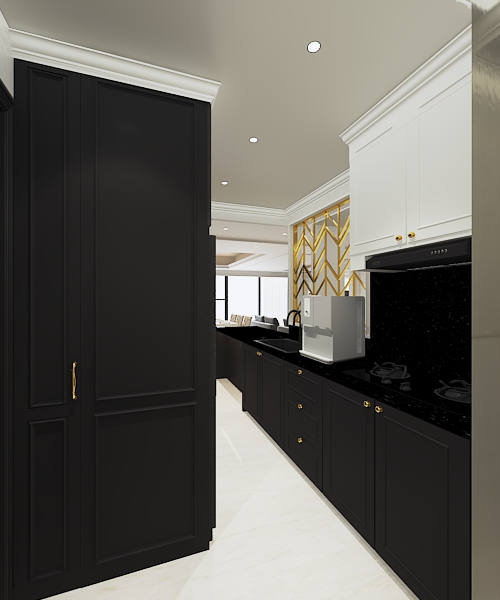 use warm light ambiance enhance the classical modern kitchen and enhance the realistic rendering on this 3d image using beige marble glossy finish by use the same texture on the image right now enhance the realistic render of this image help to make the kitchen appliances to be as real as possible too