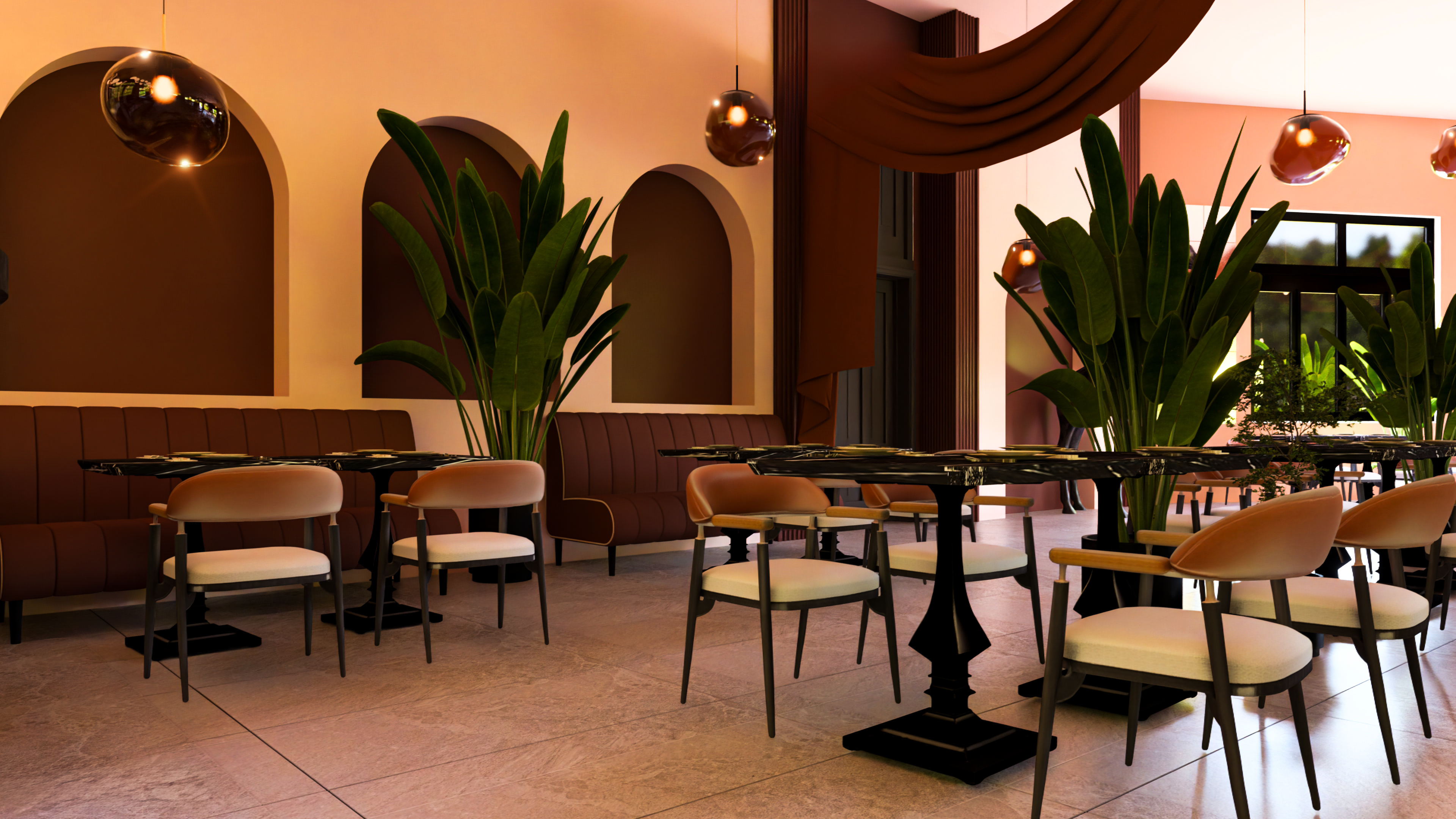 a realistic restaurant italian painted bronze patterned walls a darker color inside the niche salmon color throughout the walls a stylish ambiance soft and stylish lighting gently refracted sunlight a light marble texture on the floor