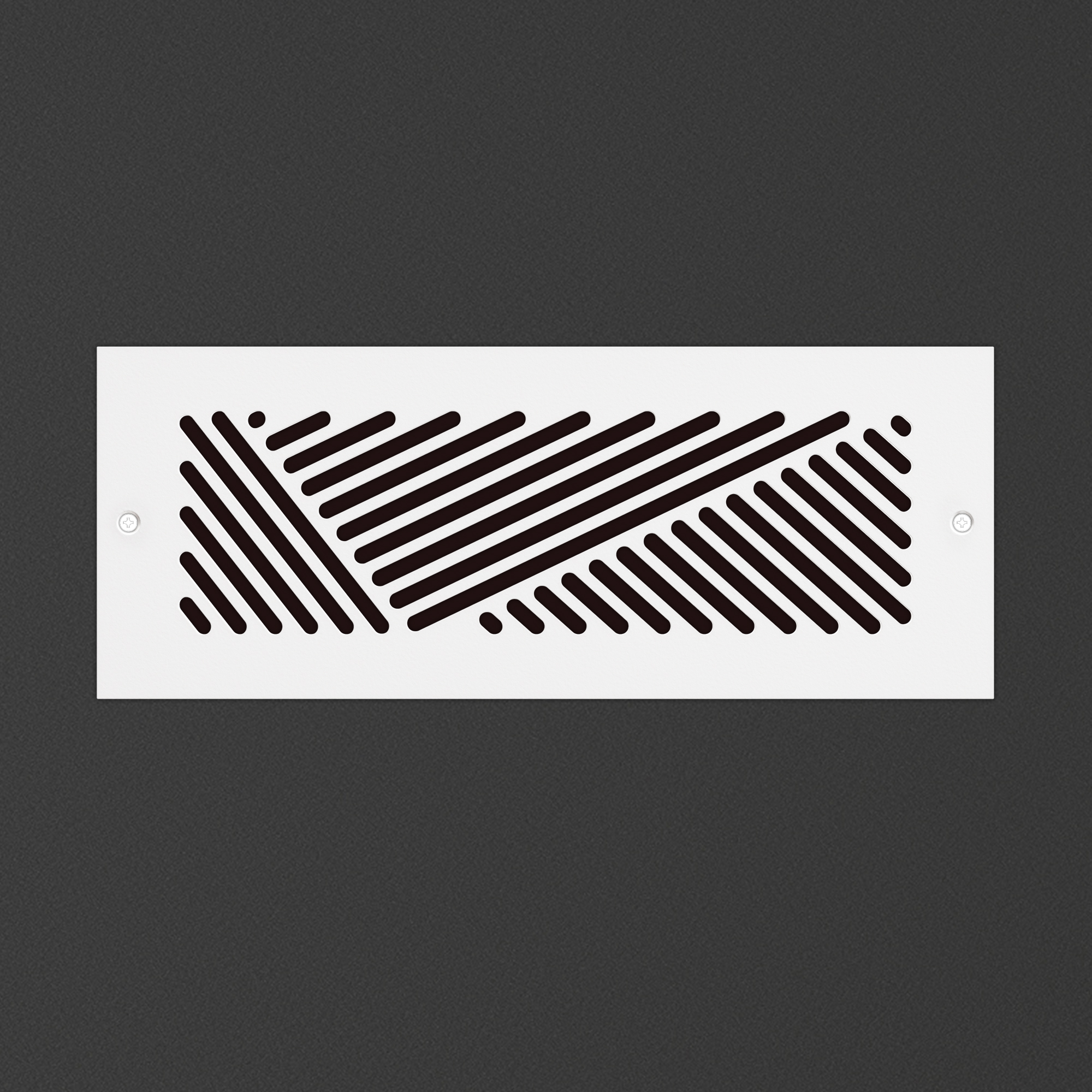 close up photograph of a luxury hotel room wall soft neutral linen textured wallpaper in warm taupe mounted 8 inches below the ceiling line is a modern decorative white rectangular hvac vent cover with a geometric herringbone diagonal line pattern cutout design and small phillips head screws on each end subtle woven fabric wall texture soft ambient lighting interior design photography shallow depth of field crisp white crown molding visible at top edge warm natural light high end boutique hospitality aesthetic 85mm lens photorealistic
