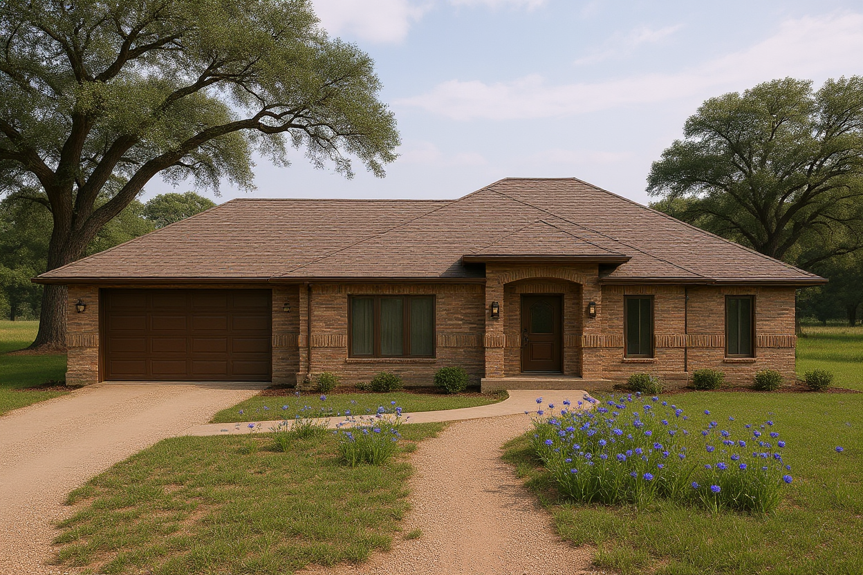 texas farm land setting with medium height foundation planting mottled brown roman brick bronze paint on doors windows fascia cream colored window frames oak trees in yard taper walk up to front porch gravel drive to garage door infill yard with fields of blue wildflowers in yard ramp sidewalk up to front porch ledge at base of house is concrete wall lights both sides of garage door sunset with interior lighting