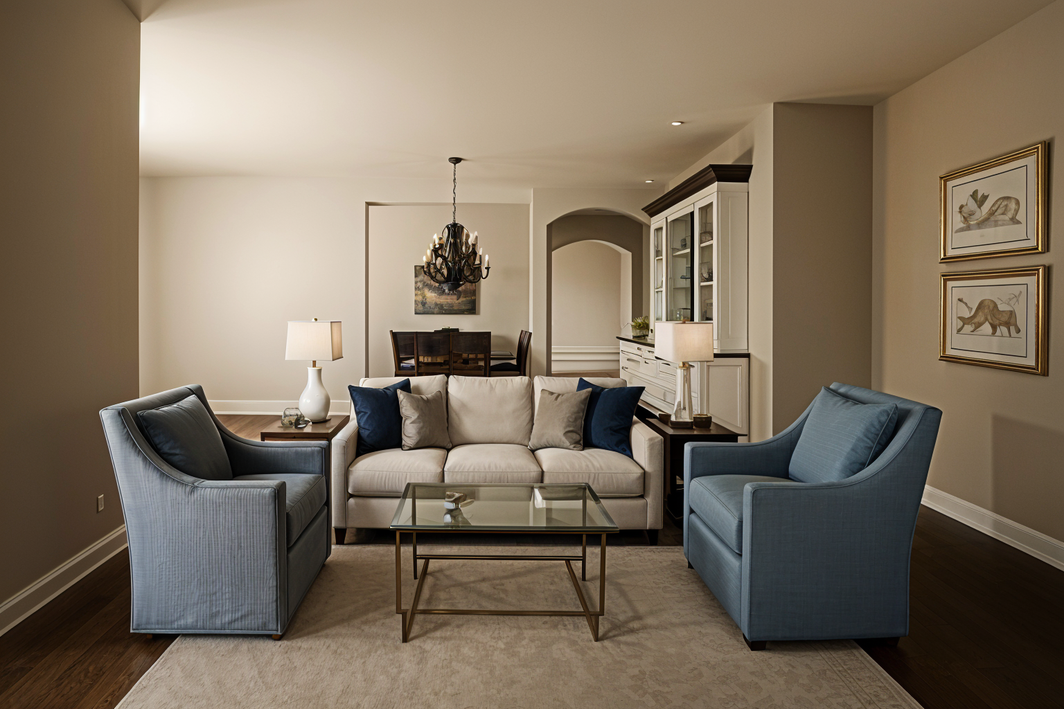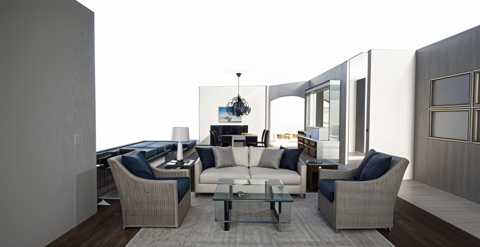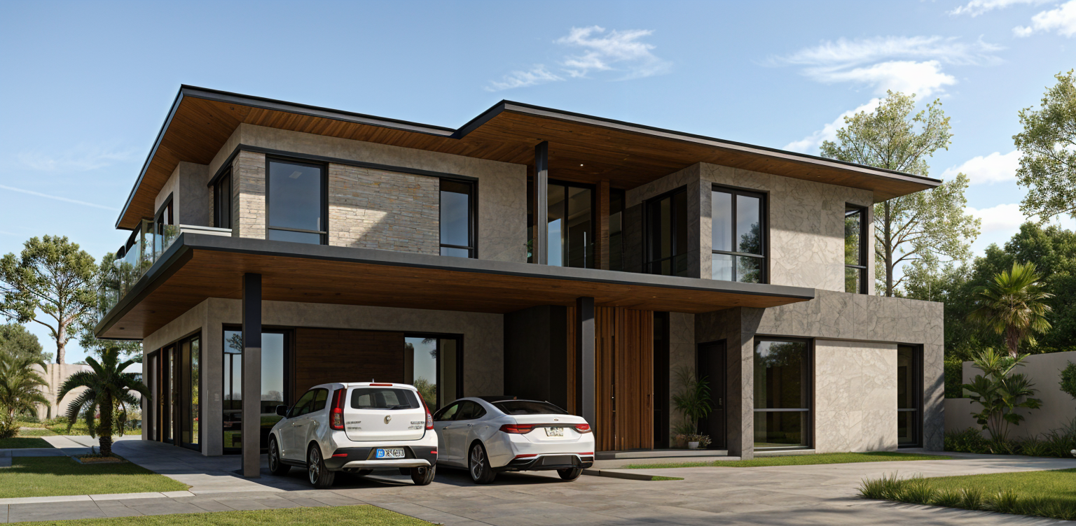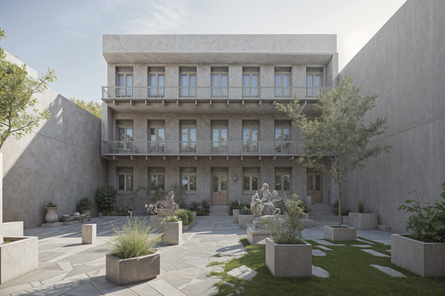 render a serene courtyard scene with a classic three story building the walls are a soft textured gray with large white framed windows and green railings the courtyard features a decorative mosaic floor with swirling gray and white patterns lush potted plants and trees in deep green add vibrancy a few elegant statues are scattered around blending artfully with nature the atmosphere is calm and inviting under a bright blue sky with fluffy white clouds casting soft shadows across the scene architecture