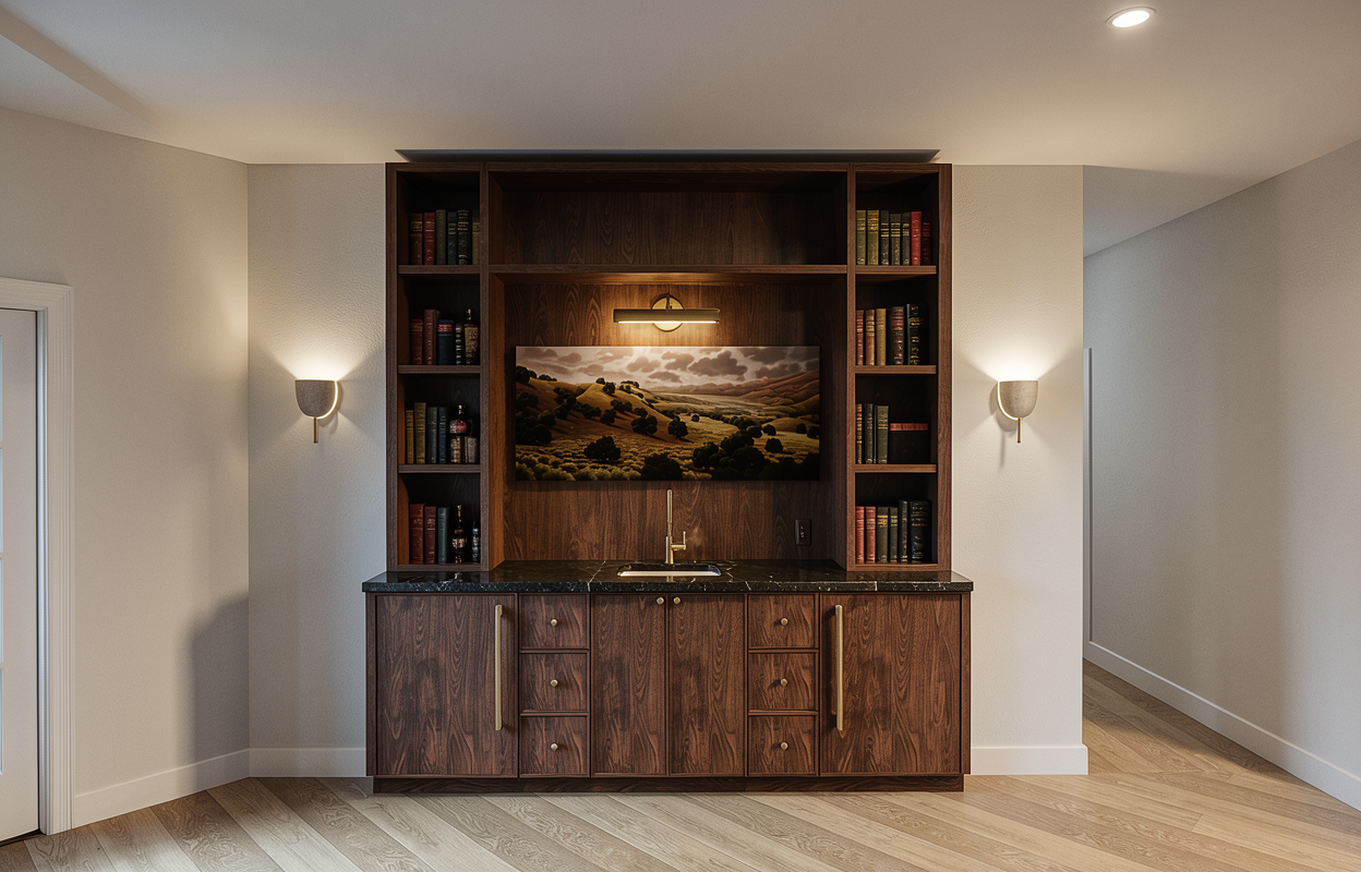 bring life to this rendering with elegant details that fit the feeling of a moody library like bar keep the white wall on the right the same keep the flooring light oak add more bar accessories add a dark green area rug in the bottom of the scene