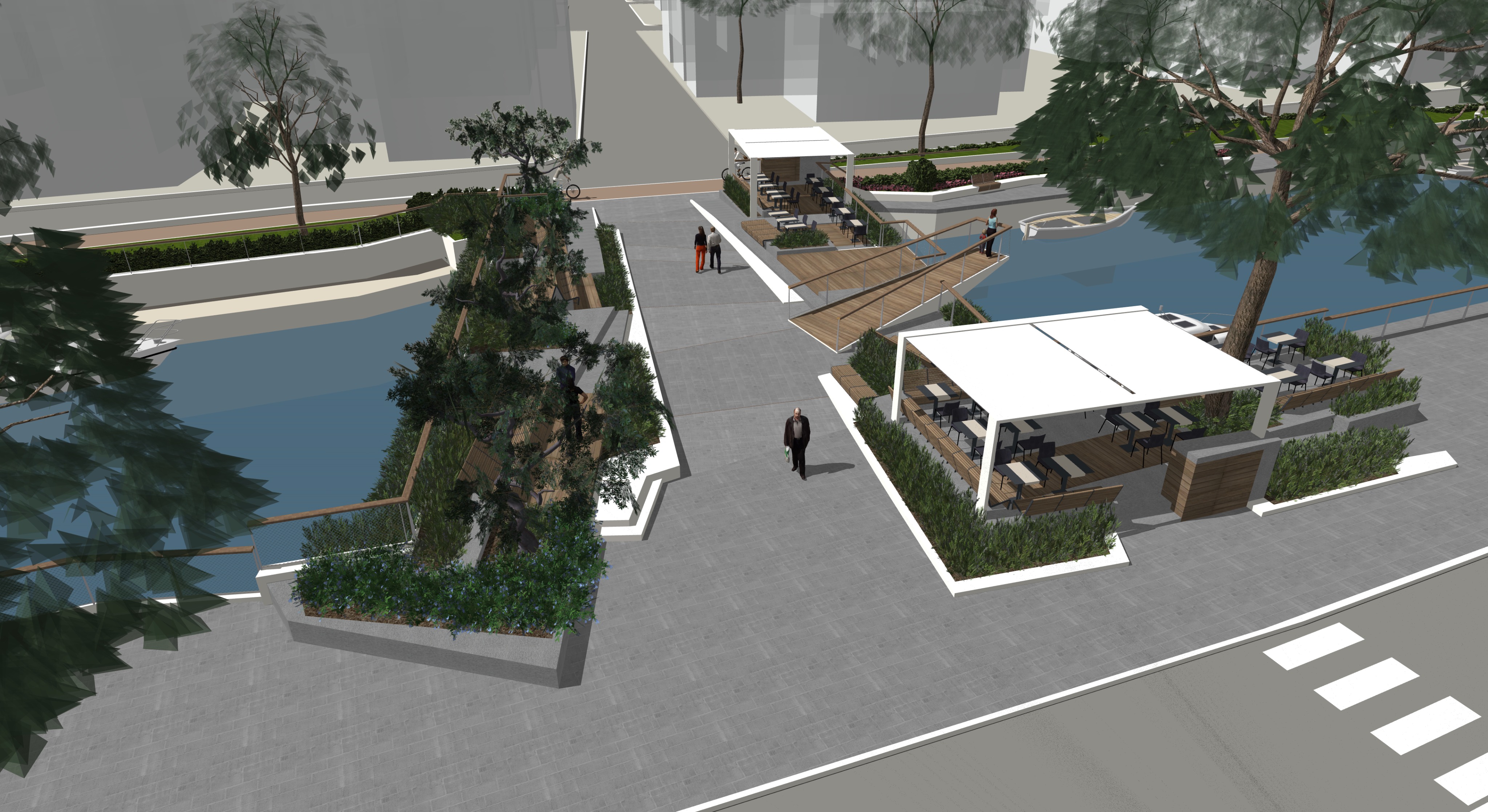 new street furniture on the bridge over the river a beautiful warm sunny summer day many people are sitting at tables while others stop to chat or walk keep the buildings close together with light abstract volumes without adding doors windows frames or other details
