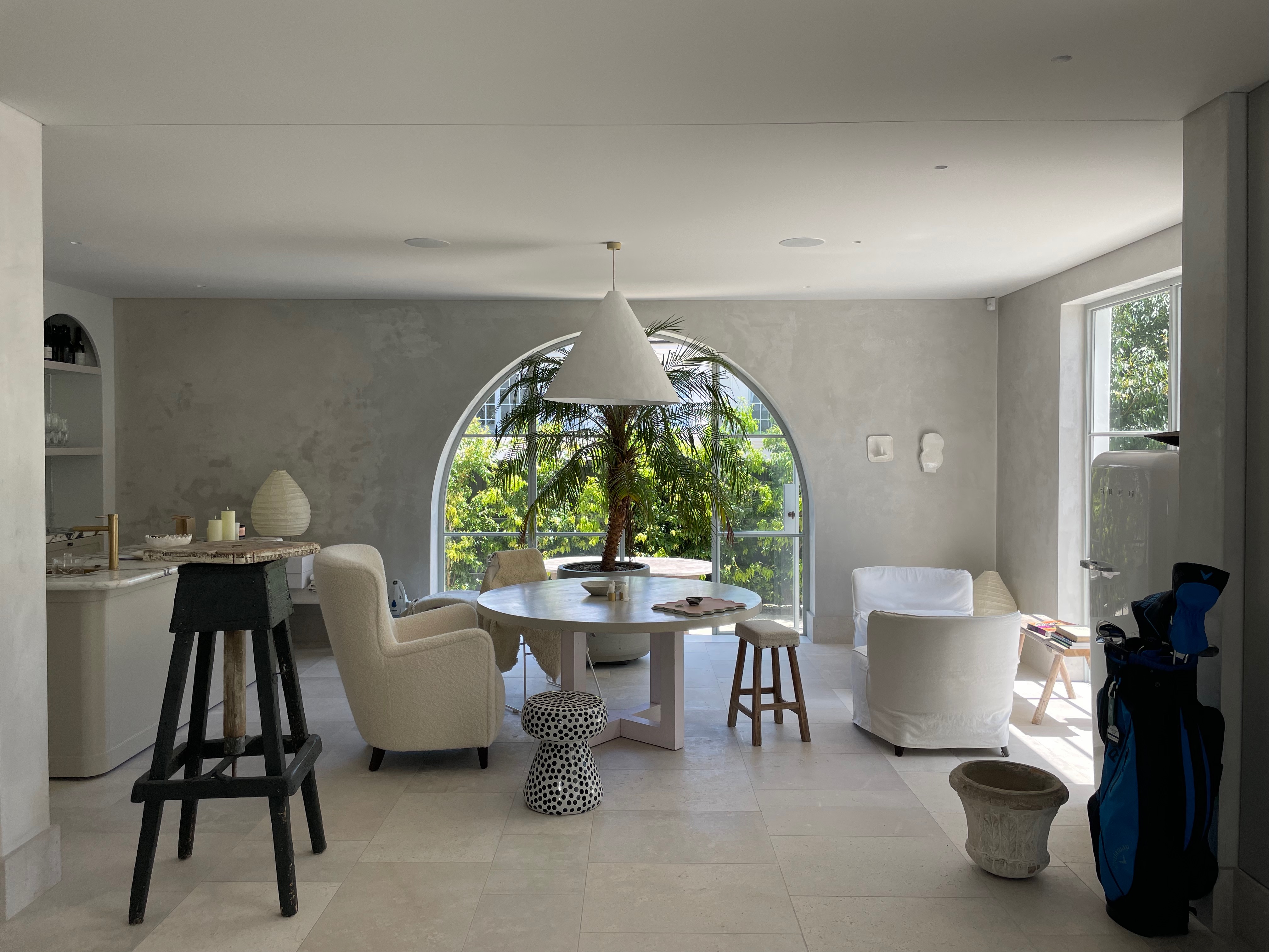 remove golf clubs the blue black bag on the right remove black timber framed furniture item in the foreground on the left remove the glossy white cabinet on the right that is behind the column and in front of the right glazing external light to be ldusk render with the all down lights pendant and lamp on