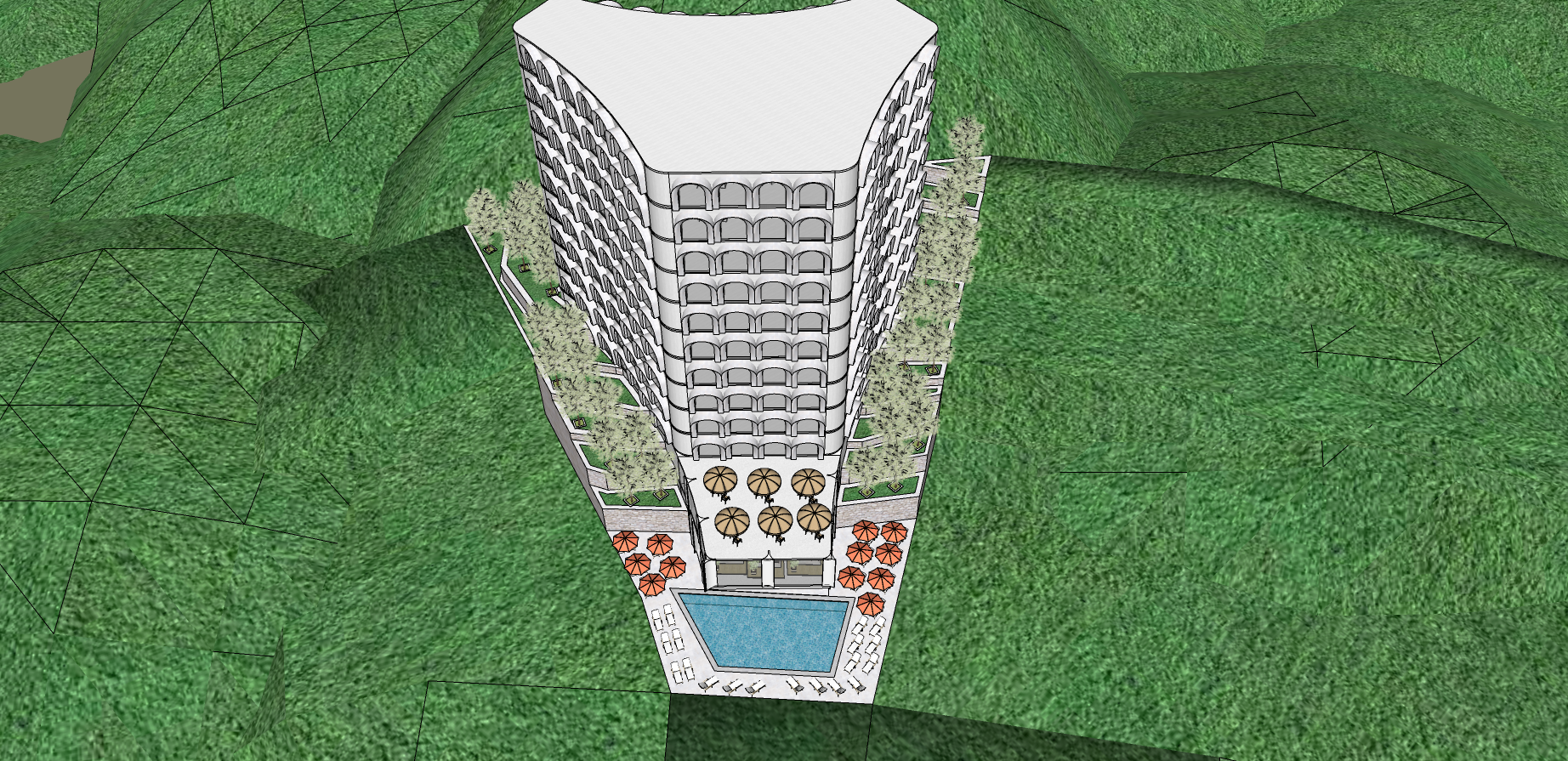 create a digital rendering of a tall elegant building with classical architectural features the structure has multiple arches and is set against a backdrop of lush rolling hills use a crisp white for the building s fa ade accentuated by subtle gray shadows to highlight the depth of the arches surrounding the building incorporate rich green hues for the hills creating a vibrant natural landscape add a serene blue for the swimming pool with sun loungers in soft beige the terrace features dining tables with dark brown finishes and warm colored parasols set the scene under a clear bright sky to evoke a tranquil and inviting atmosphere the area has elite medium tall residential buildings