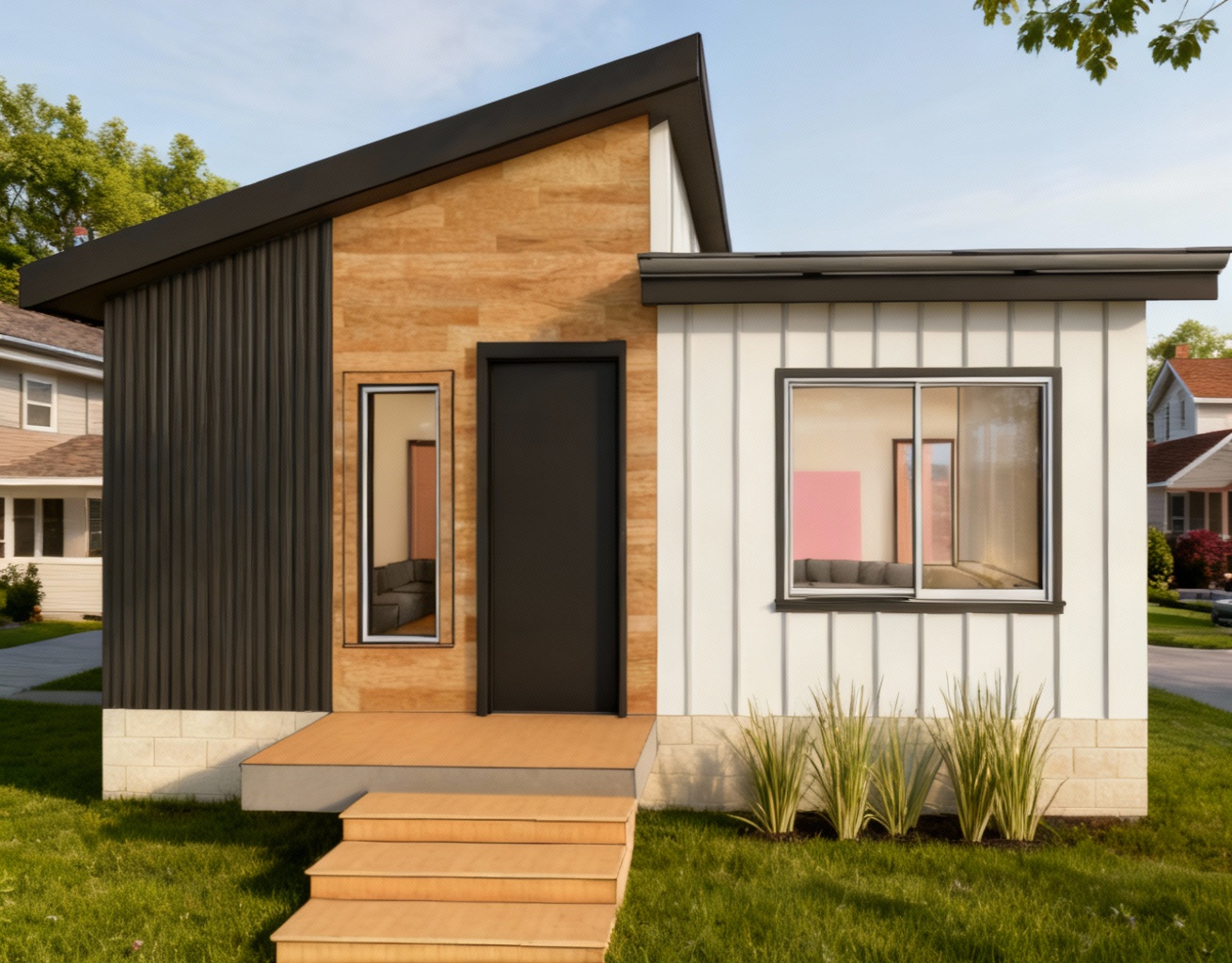 render this house as if they were in a neighborhood add simple modern ornamental grasses use vertical board and batten siding spaced 16 apart on the right side use vertical board and batten siding on the left side spaced 6 apart add a cylinder porch light ro the right of the front door match the color of the siding to the color in the drawing