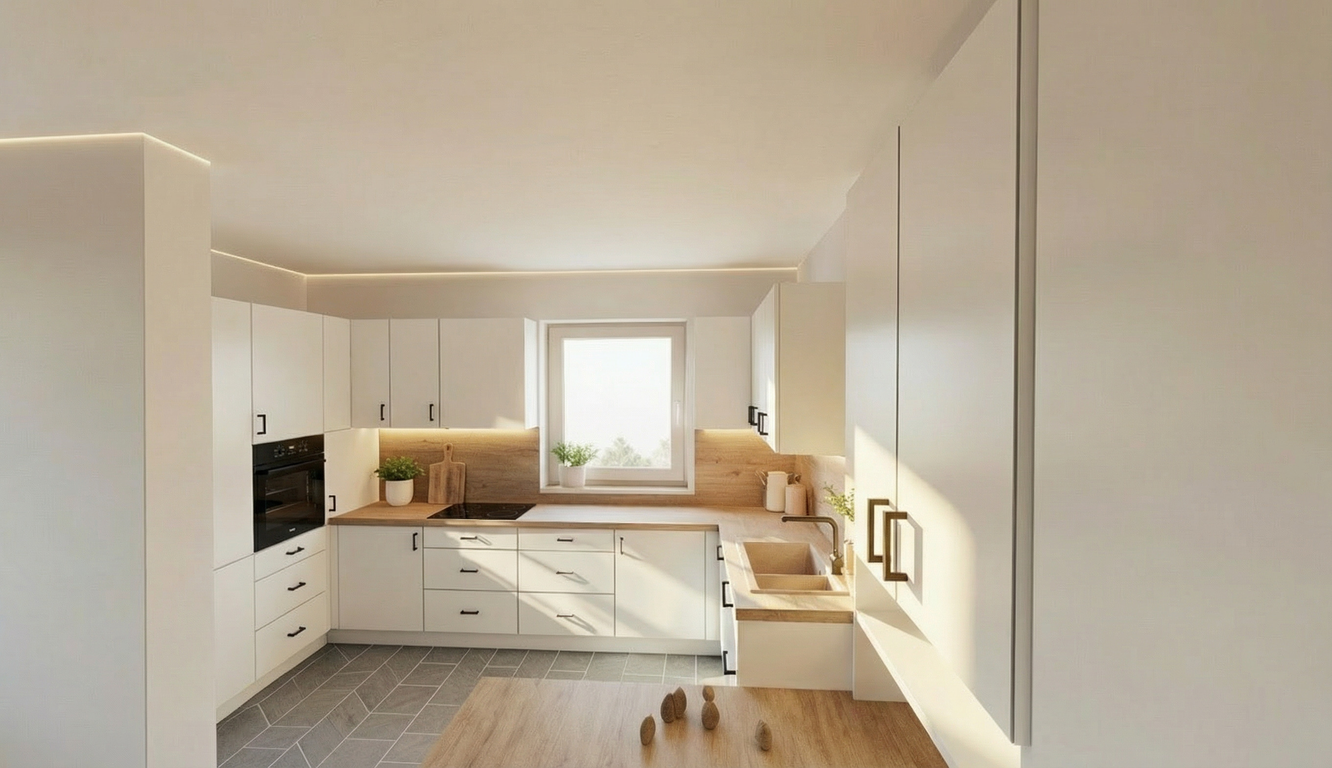 mach mir bei dieser variante die arbeitsplatte und die r ckwand in einer hellen steinoptik der tisch vorne bleibt in eiche