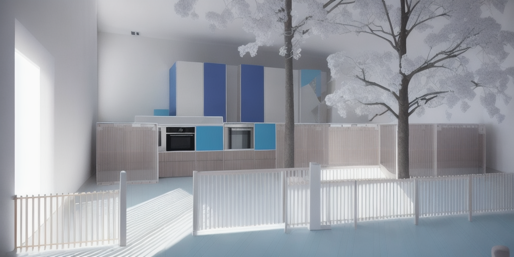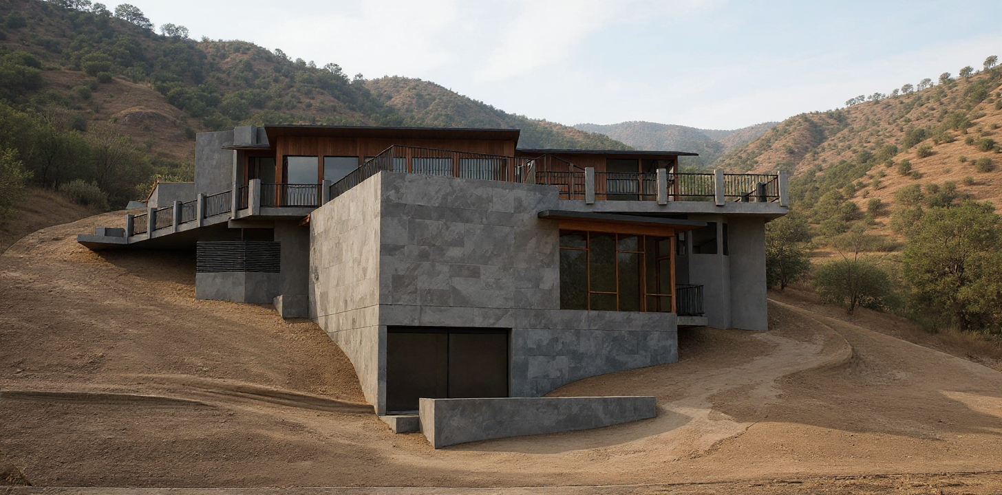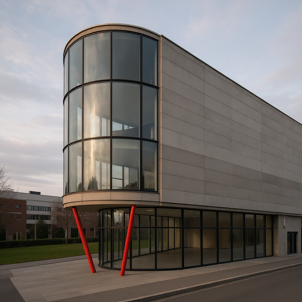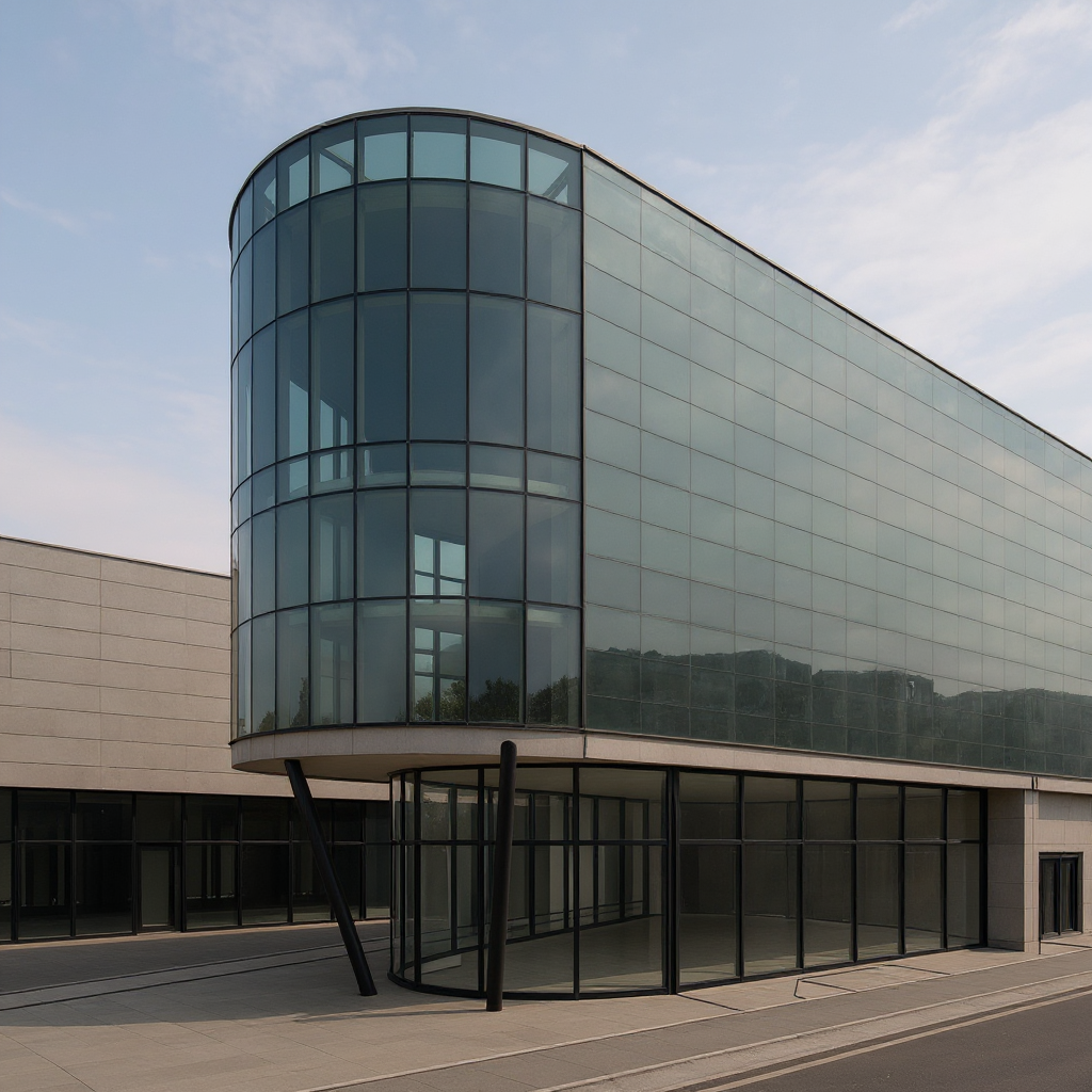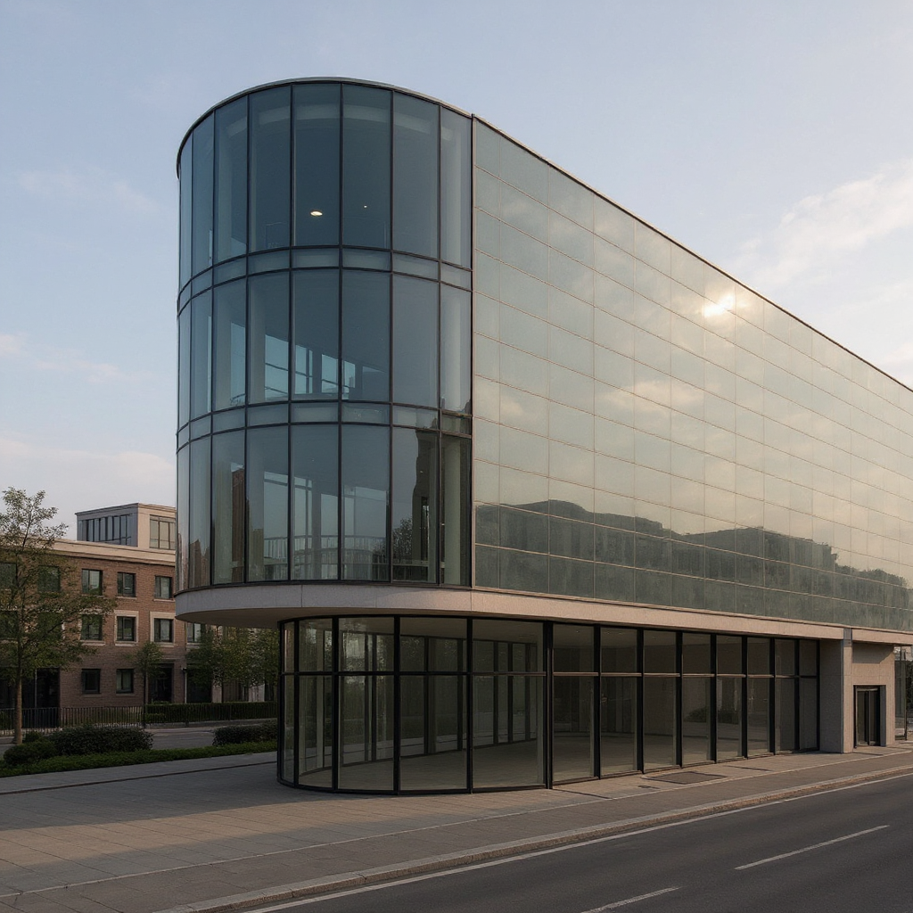 render building with modern glass wall and slander columns round corner to be higher than rest of the building