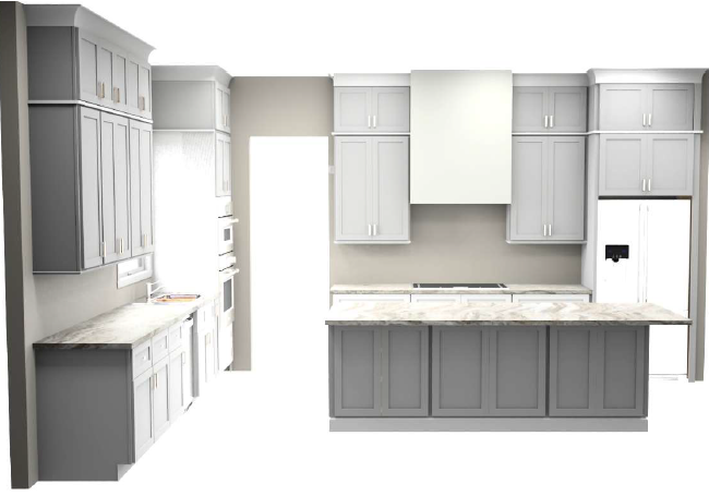 maintain the exact kitchen layout cabinetry style and all architectural elements do not alter the design proportions or placement of any components only update finishes and materials flooring apply happy floors tierra castanho 10706 c throughout the kitchen floor the tile should read as a warm earthy medium brown tone with subtle natural variation and a matte finish install in a clean consistent layout that enhances the natural movement of the tile cabinetry base cabinets rugby cabinetry in kodiak stain rich warm wood tone with visible grain upper cabinets tall cabinets and hood rugby sand painted finish soft warm neutral light creamy beige tone not gray or stark white maintain existing cabinet door style and layout hardware apply champagne bronze finish hardware throughout use pulls on all doors and drawers for a cohesive elevated look finish should read as warm metallic not too yellow or overly shiny countertops apply cambria ironsbridge quartz countertops surface should have a soft white cream base with subtle warm veining in beige and taupe tones maintain a polished finish with natural elegant movement lighting color accuracy use bright neutral lighting to ensure all finishes read true to color no cool or overly warm color cast avoid shadows that distort material tones preservation do not modify backsplash appliances plumbing fixtures or overall layout preserve all existing elements exactly as shown aside from the specified finish updates