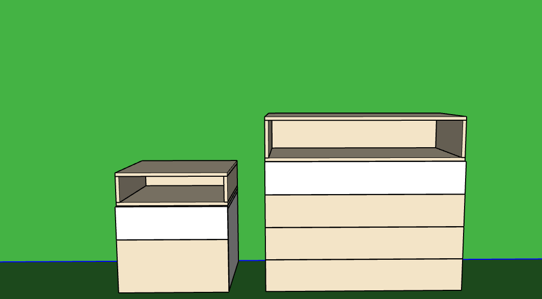 realistic image of this chest drawer and bedside table in a bedroom using the colours white and beige as in the photo
