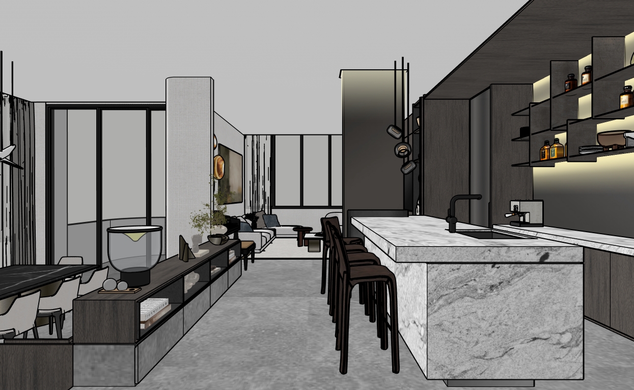 render with natural light column design and pantry backing in dark bronze pvd stainless steel condo view colder tone