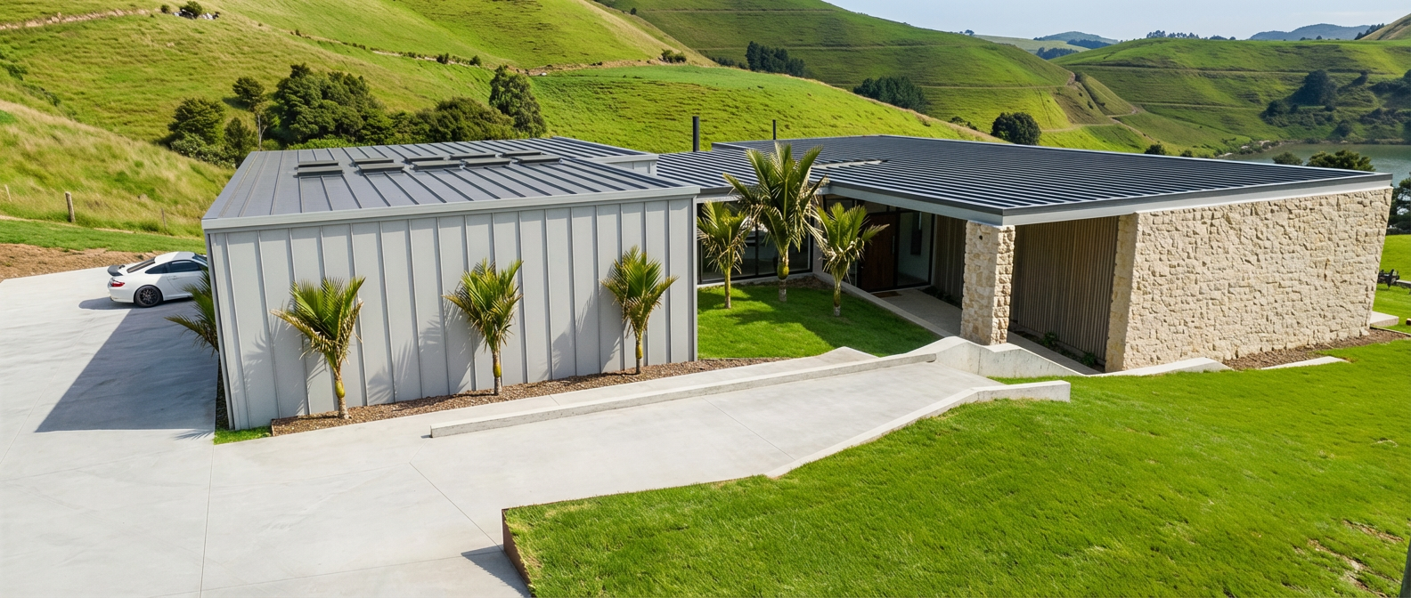 render a modern living room with a cozy and warm atmosphere use rich wooden tones for the ceiling beams and paneling the walls should be a soft white add a beige sofa with deep blue accent cushions include a round wooden coffee table with a dark metal base place an elegant plant in the corner with vibrant green leaves the floor should be a light wood with a plush white and cream area rug dining counter on the left with light brown subway tiles on the bottom and stone finish on the upper wall wooden shelves with led lights the bookshelves on the right have green olive shelves with tiber poles and the front panels are stone finish use subtle warm lighting fixtures suspended from the ceiling to enhance the inviting ambiance use daylighting and interior lighting also to illuminate the space