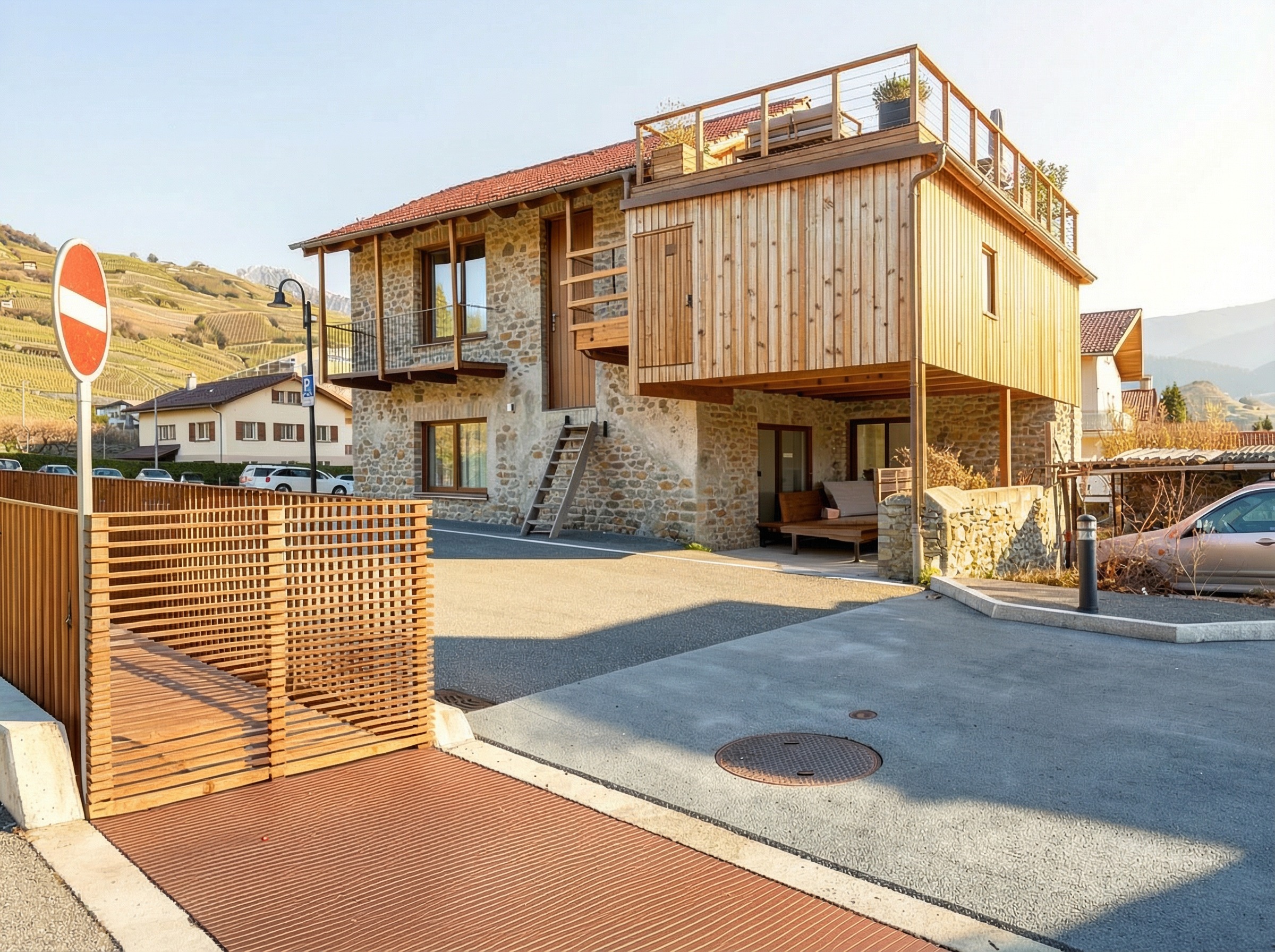 supprimer la porte sur la facade bois agrandir la petite fenetre en fenetre en bandeau sur la facade au soleil remonter les lames bois du volume en bois jusqu a mi hauteur du garde corps de la terrasse le reste laisser comme ca