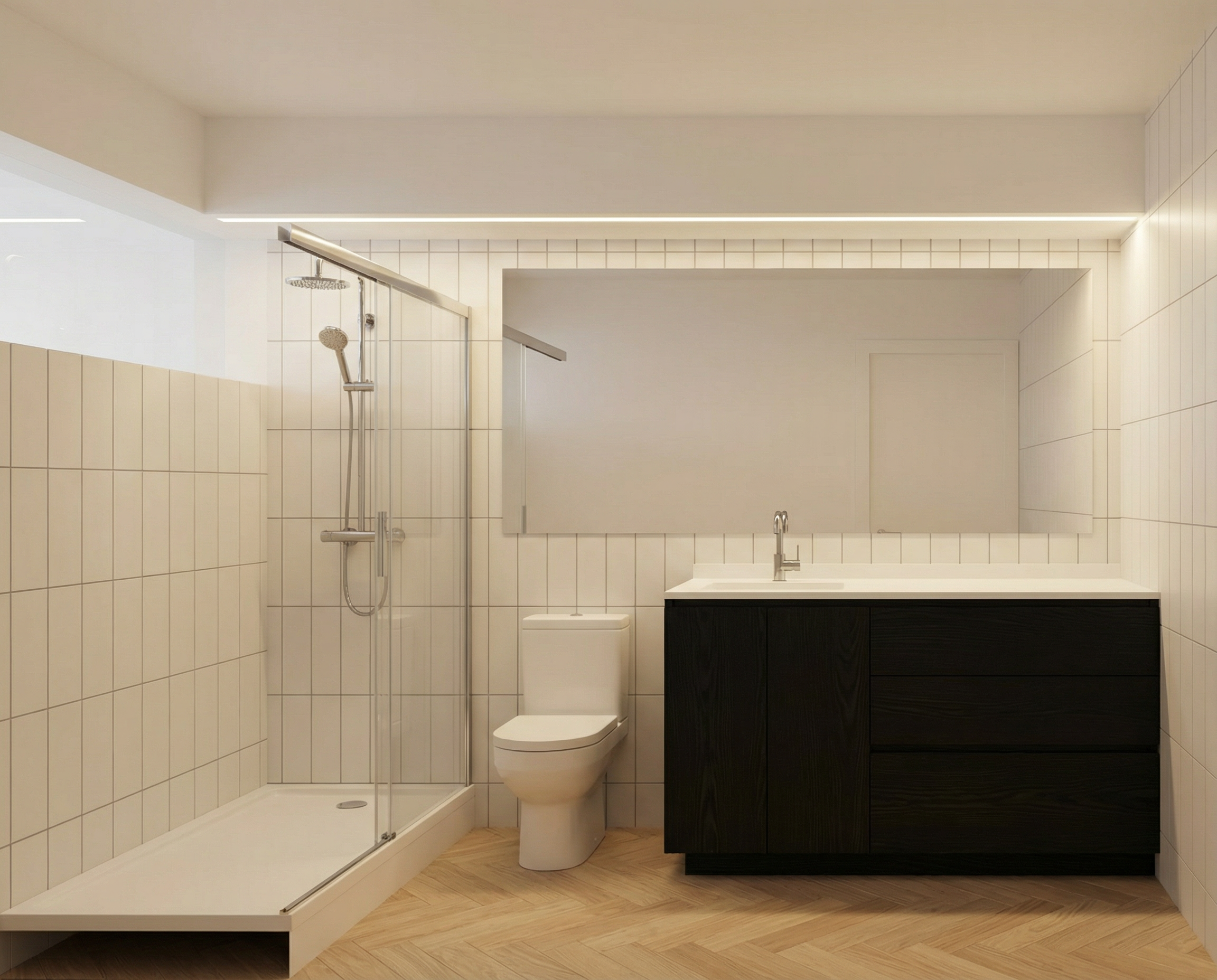 interior rendering instructions bathroom light colored wooden parquet flooring laid in a 45 degree herringbone pattern matte white ceramic wall tiles 30 10 cm installed vertically white countertop black wood cabinet with visible natural wood grain place a wall mounted vanity basin on the left side of the cabinet with a chrome plated steel faucet place a standard wc between the vanity cabinet and the shower area modify the existing shower tray geometry bottom left and replace it with a white shower tray install a sliding glass shower door over the shower tray enclosing the shower area within the bathroom on the back wall above the shower tray install a chrome plated steel shower set including shower bar and shower head place a mirror above the vanity and the wc install a continuous led strip light integrated into the beam above the vanity running along the entire length of the bathroom the beam is white with no tiles applied the window glass should be clearly visible with subtle reflections exterior lighting should be soft morning light with gentle daylight and partially visible tree branches outside creating a calm and natural atmosphere in the mirror reflection very soft reflection the vertically installed 30 10 cm ceramic tiles must be visible along with a black door that is located on the wall opposite the vanity positioned to the right side of the image not on the right hand wall of the bathroom