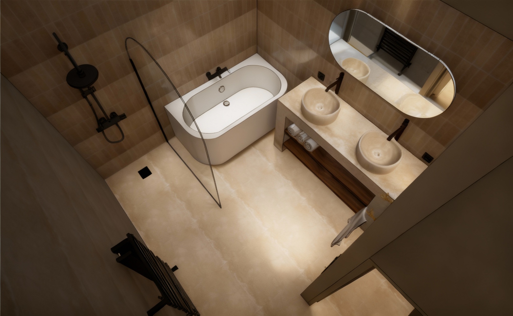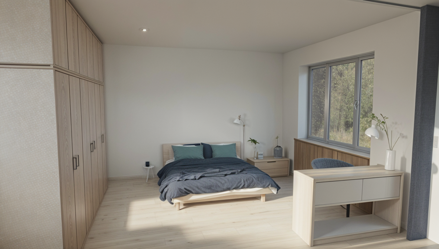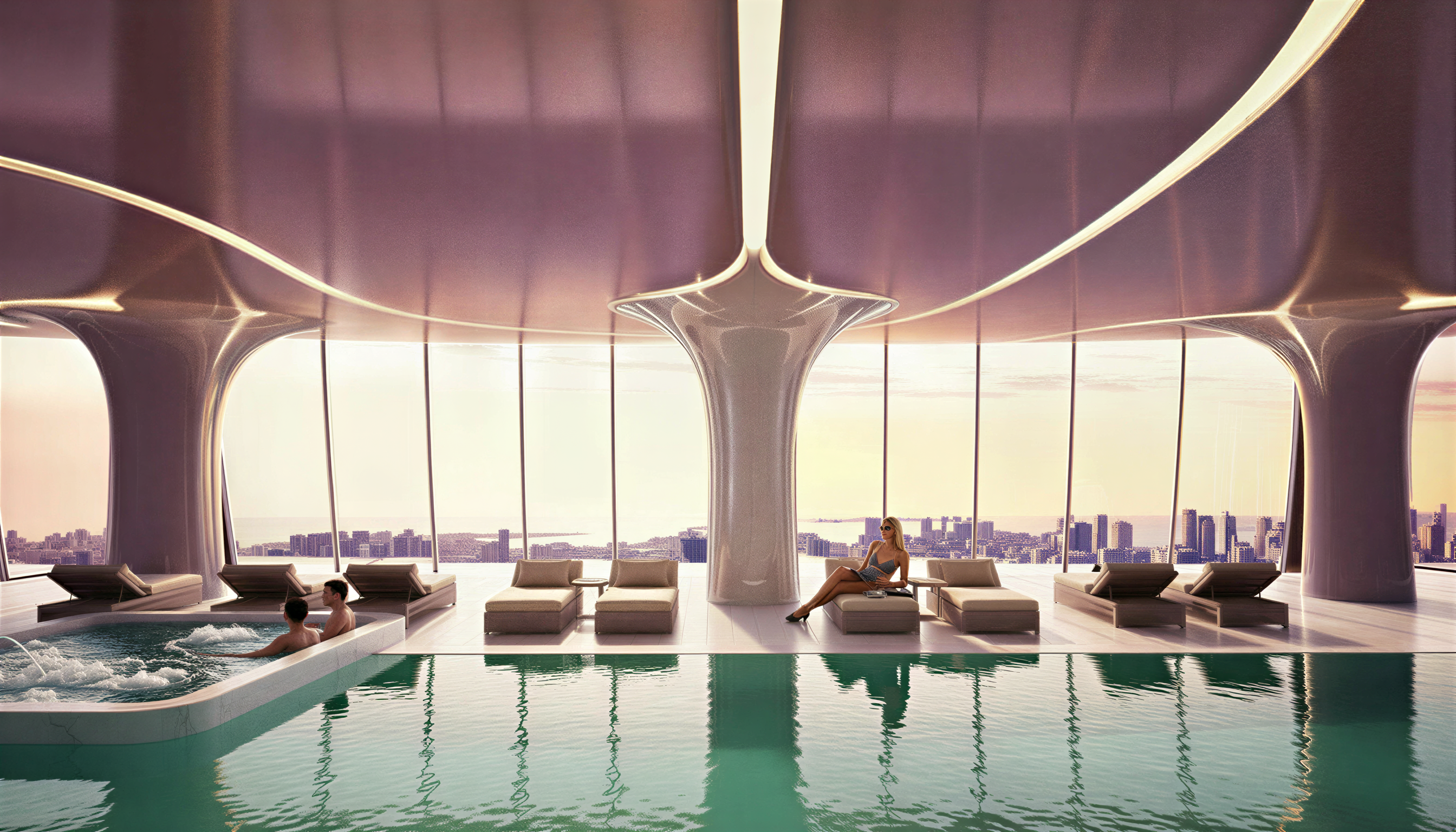 luxurious modern indoor pool area with sleek futuristic architecture the ceiling features smooth curved pillars in soft lavender hues warm ambient lighting casts a serene glow enhancing the tranquil atmosphere plush taupe lounge chairs align the poolside inviting relaxation the pool s water reflects a vibrant turquoise color creating a refreshing contrast large floor to ceiling windows reveal an expansive ocean view with a gentle blend of soft pink and orange tones from the setting sun the mood is calm elegant and indulgent