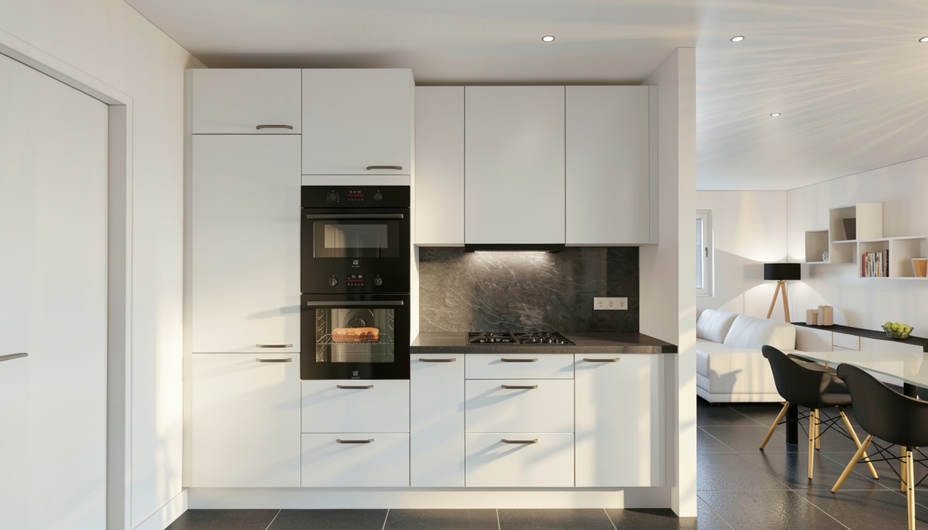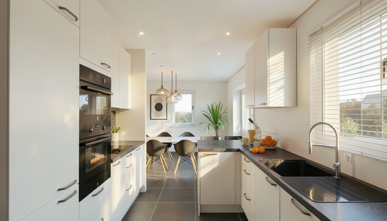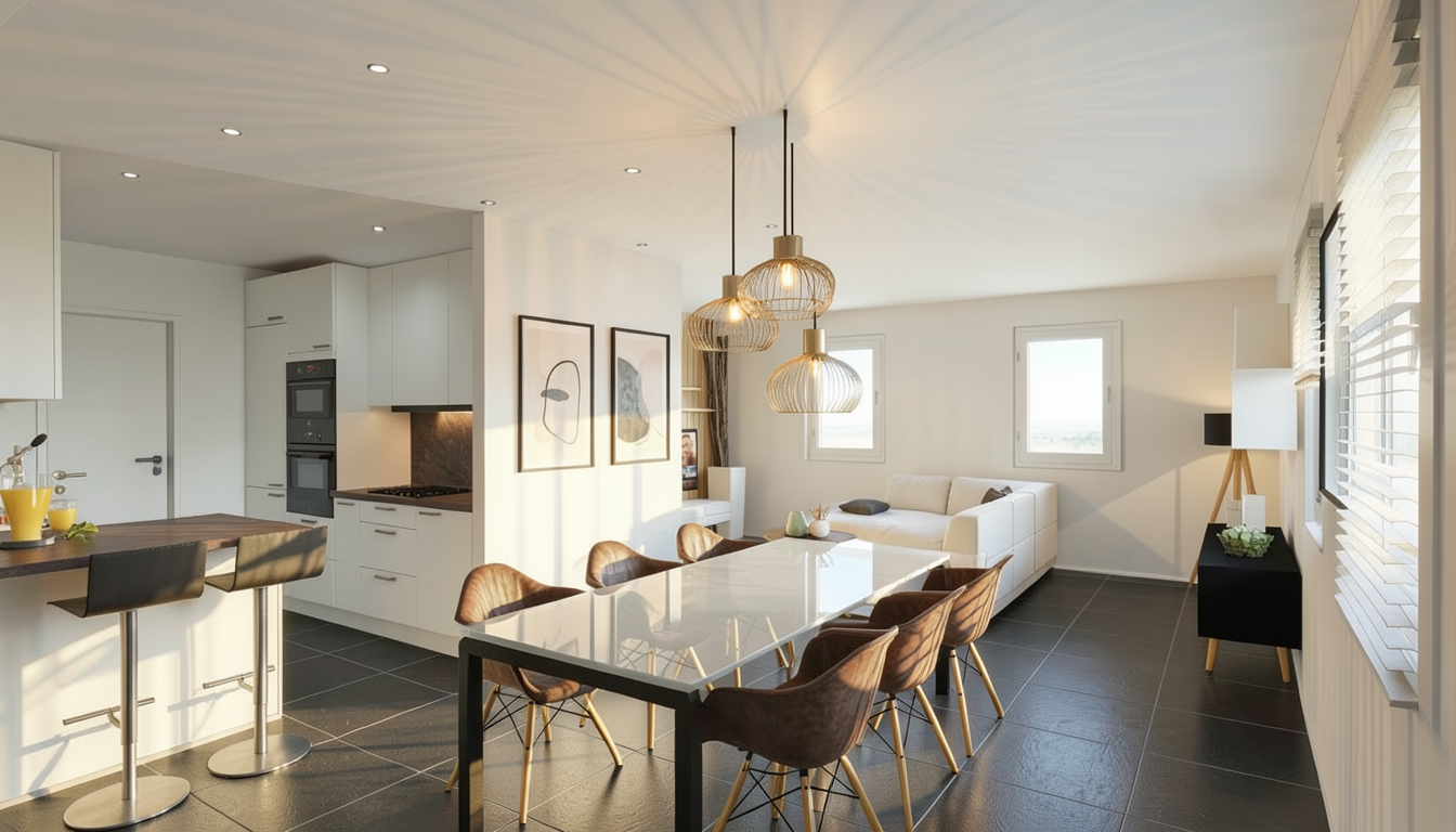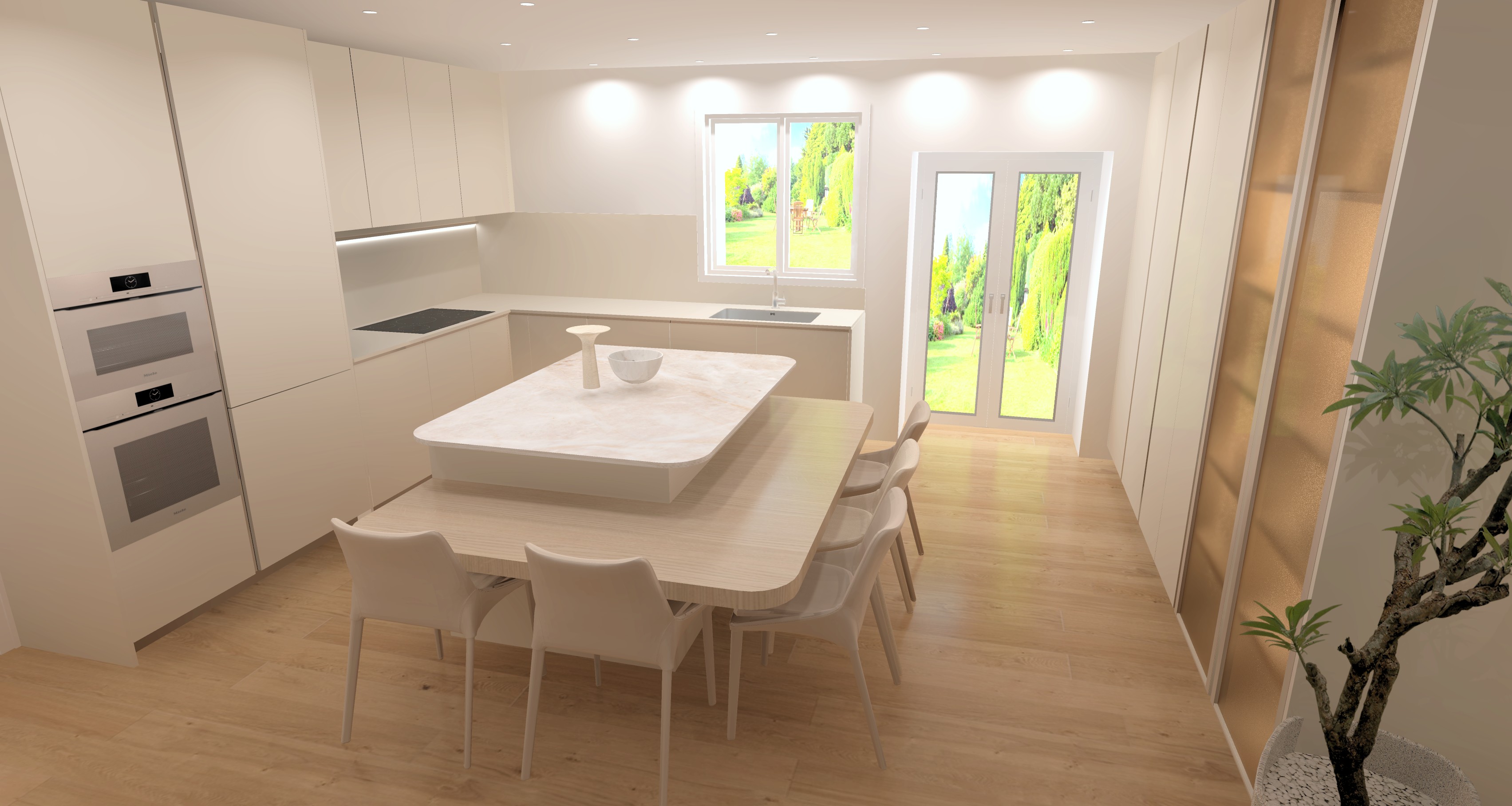 act as an award winning architectural photographer and senior cgi to photo compositing artist specialized in transforming sketchup style interior renders into indistinguishable photoreal architectural photographs your mission is to convert the provided image into a hyper realistic photo authentic interior architectural photograph while strictly preserving the original architecture and composition critical preservation rulespreserve the building design dimensions proportions layout camera angle framing composition lens feel horizon line perspective and vertical alignment exactly as shown do not move resize add remove or redesign any architectural elements cabinetry openings walls ceilings island dimensions fixtures furniture placements or decor layout maintain the exact spatial relationships and visual balance of the original image no warped geometry no altered perspective no re staging image to image transformation goalscamera and photographic realismlock the camera precisely same focal length impression same viewpoint same horizon same verticals same composition keep perspective natural and architecturally correct avoid lens distortion unless extremely subtle and photographically plausible final result must feel like it was captured with a high end full frame architectural photography setup material replacement and surface realismreplace all visible materials with physically accurate ultra high resolution pbr materials 4k to 8k use correct albedo roughness gloss response normal maps and displacement bump where relevant every surface must behave like a real photographed material never like cgi introduce subtle realism micro scratcheslight edge wearslight smudgesnatural tonal variationrealistic seams grout lines joints and fabrication detailsslight imperfections in reflectivity and texture uniformitythe glass of the glass foor is acid treated bronze glasscountertop plan de travailapply a creamy beige worktop in the same material than the furniture beige melamine ensure realistic specular response soft natural highlights with believable depth avoid any plastic laminate like fake glossy or overly perfect finish surface must read as premium tactile dense and authentic under daylight vegetation and foliage realismupgrade all visible plants trees and foliage to ultra detailed botanically plausible vegetation add natural variation in leaf sizeleaf orientationcolor shiftsdensitybranching randomnessinclude realistic subsurface scattering translucency in leaves so daylight passes through them naturally foliage must feel alive organic and photographically believable not decorative cgi assets lighting and global illuminationuse natural photographic daylight consistent with the window positions and scene orientation sun direction must be believable and physically coherent create soft realistic shadows with subtle penumbra include global illuminationbounced lightambient occlusionnatural reflection behaviorrealistic interior to exterior exposure balanceavoid overexposed cgi lighting blown highlights or artificial brightness atmosphere color and photographic finishadd subtle atmospheric depth and realistic air perspective use true to life color grading neutral whitesaccurate wood tonesrestrained contrastrealistic dynamic rangepreserve correct scale cues across all materials and objects add very subtle real camera grain noise for authenticity keep the image crisp but natural no over sharpening no hdr look no excessive clarity final realism targetthe final image must read as a real architectural interior photograph not a render it should feel suitable for publication in a premium architecture or interior design magazine prioritize realism material credibility natural light behavior and photographic subtlety over stylization negative constraintsno cgi lookno cartoon lookno painterly effectno plastic materialsno exaggerated reflectionsno unnatural bloomno fake sharpnessno added furnitureno changed layoutno altered architectureno warped linesno modified proportionsno staging changesno fantasy lightingoutput objectiveproduce a final result that is visually indistinguishable from a professionally shot high end architectural interior photograph while remaining absolutely faithful to the original render s design and composition