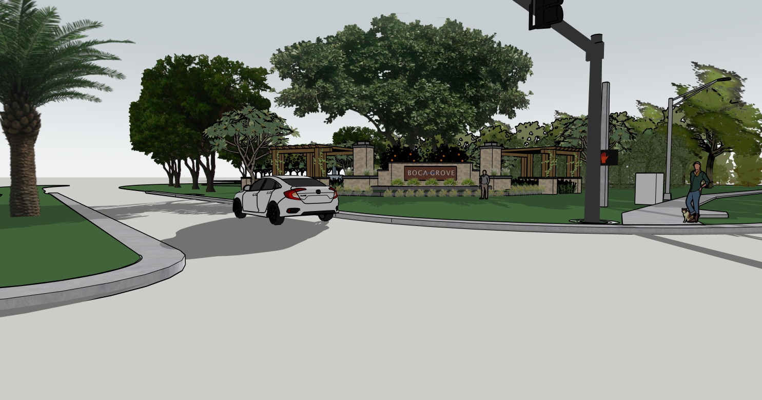 community entrance monumental sign south florida low small mixed ground cover afternoon sky lighting front area to remain as lawn