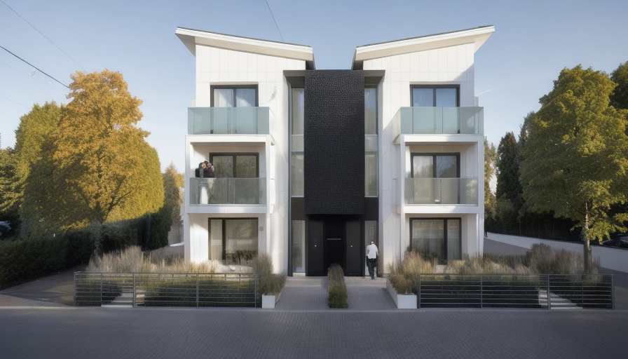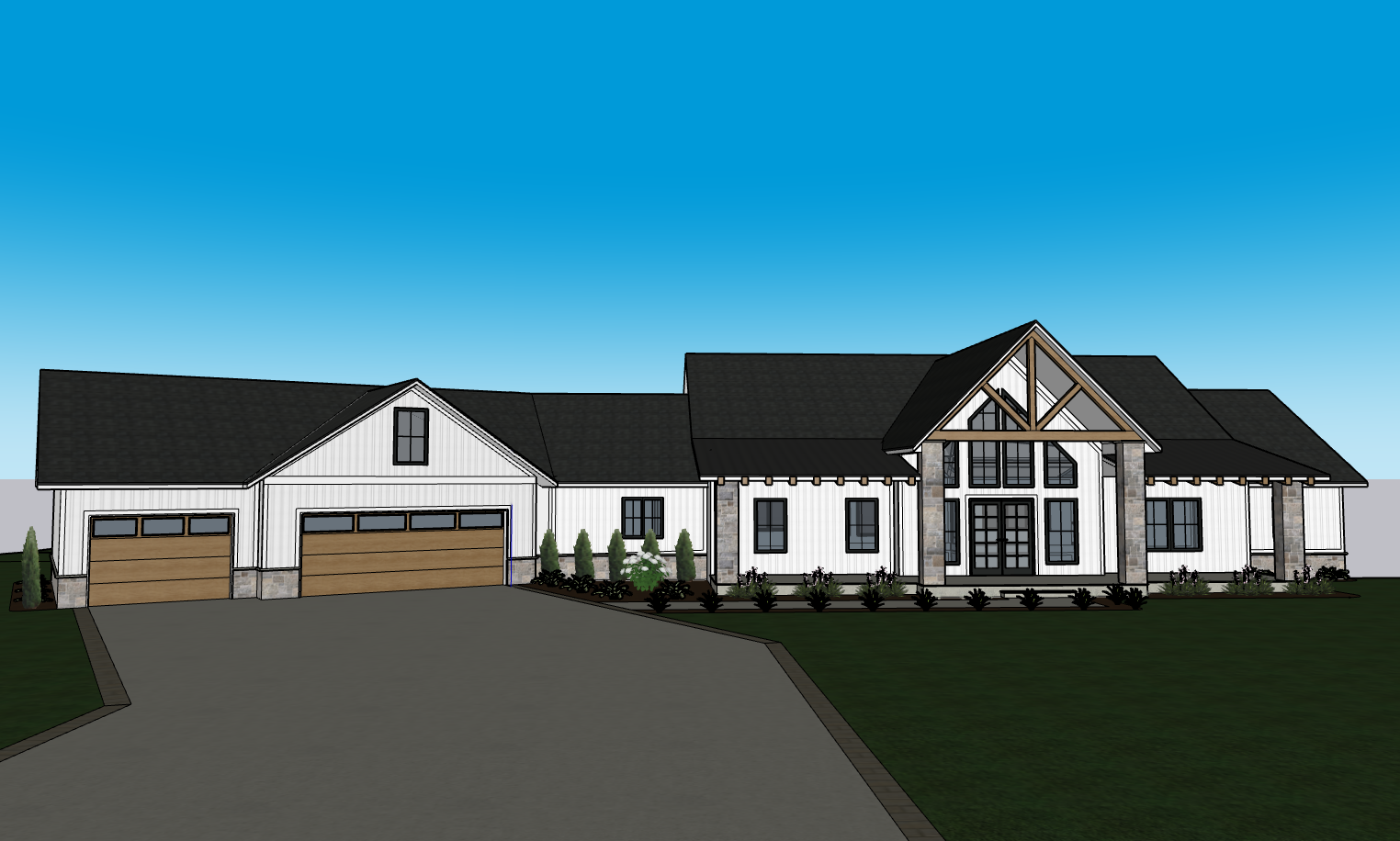 exterior shot a modern mountain farmhouse exterior under bright blue beautiful sky featuring a large single story house with an earthy chocolate fa ade and lp smart siding black quaker windows with gridded pattern the roof is steeply pitched black onyx shingles with portions of the roof being a matte black metal roofing prominent front gables display natural wood beams for a rustic touch the two garages have wooden doors in a dark walnut tone stone accents in soft gray on pillars add texture and elegance surrounding the house lush green grass and neatly landscaped bushes provide a welcoming atmosphere the sky is clear and vibrant blue creating a serene and inviting mood the paved driveway extends towards the garages with a gentle gradient of gray the overall atmosphere is peaceful and inviting