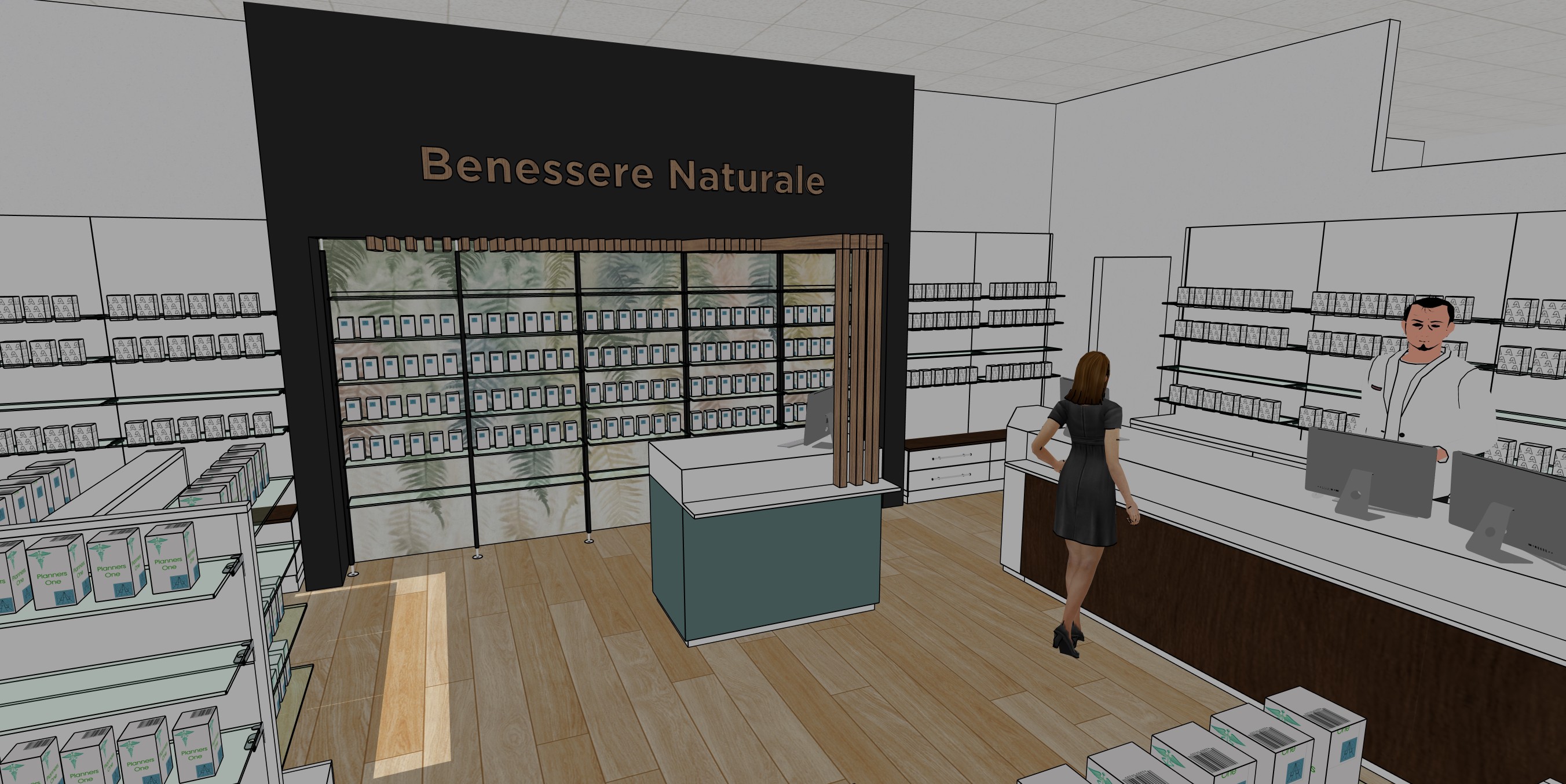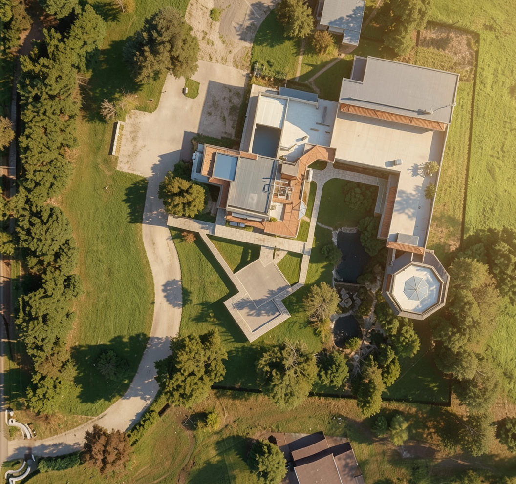 fai soffitto con illuminazione a quadrotti sparsi posizionati in maniera regolare mantieni colori originali fai una vista bella luminosa