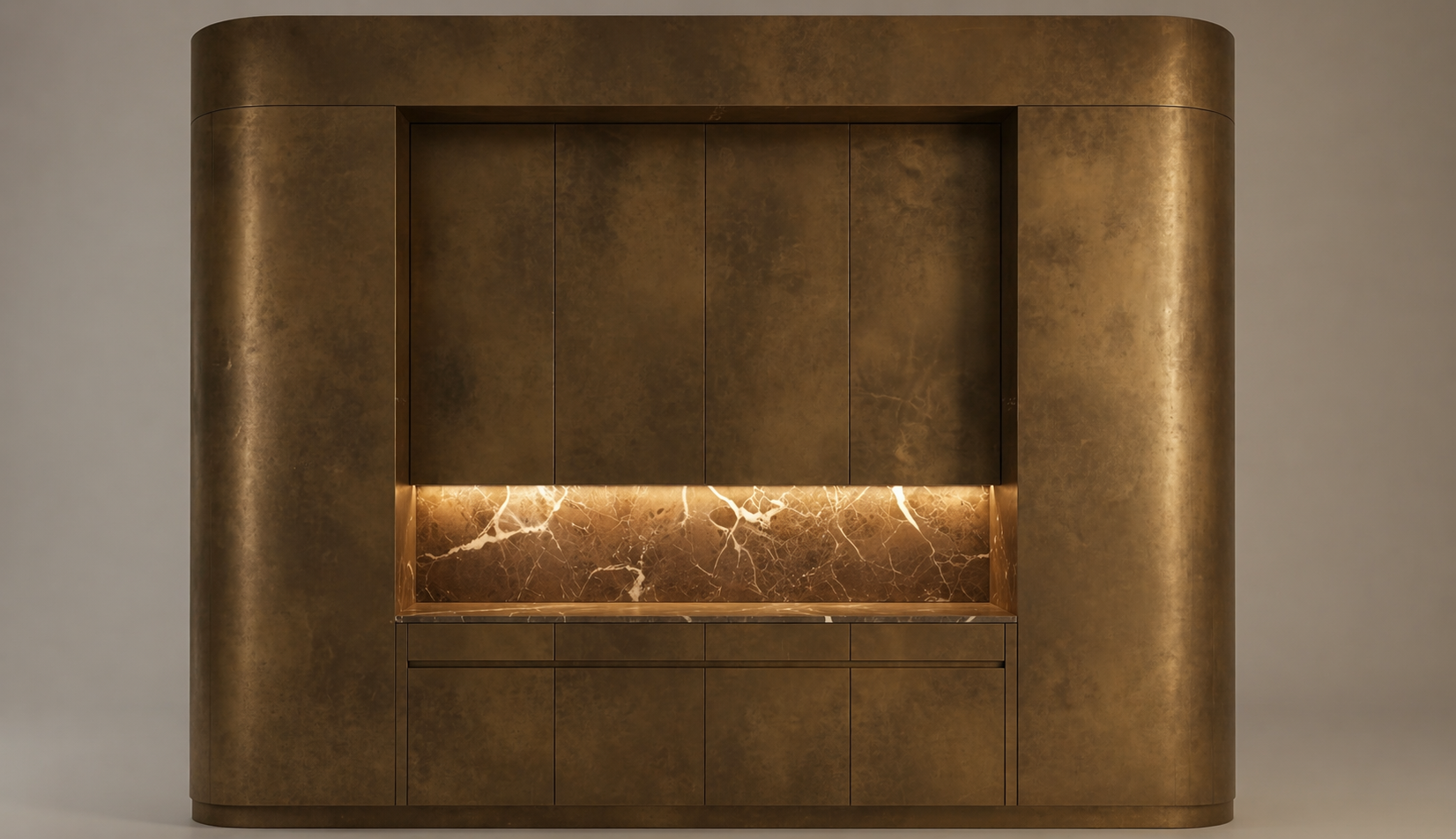 in the middle cabinets make it match the patina metal on the outside but keep a 2 marble border around the set in area