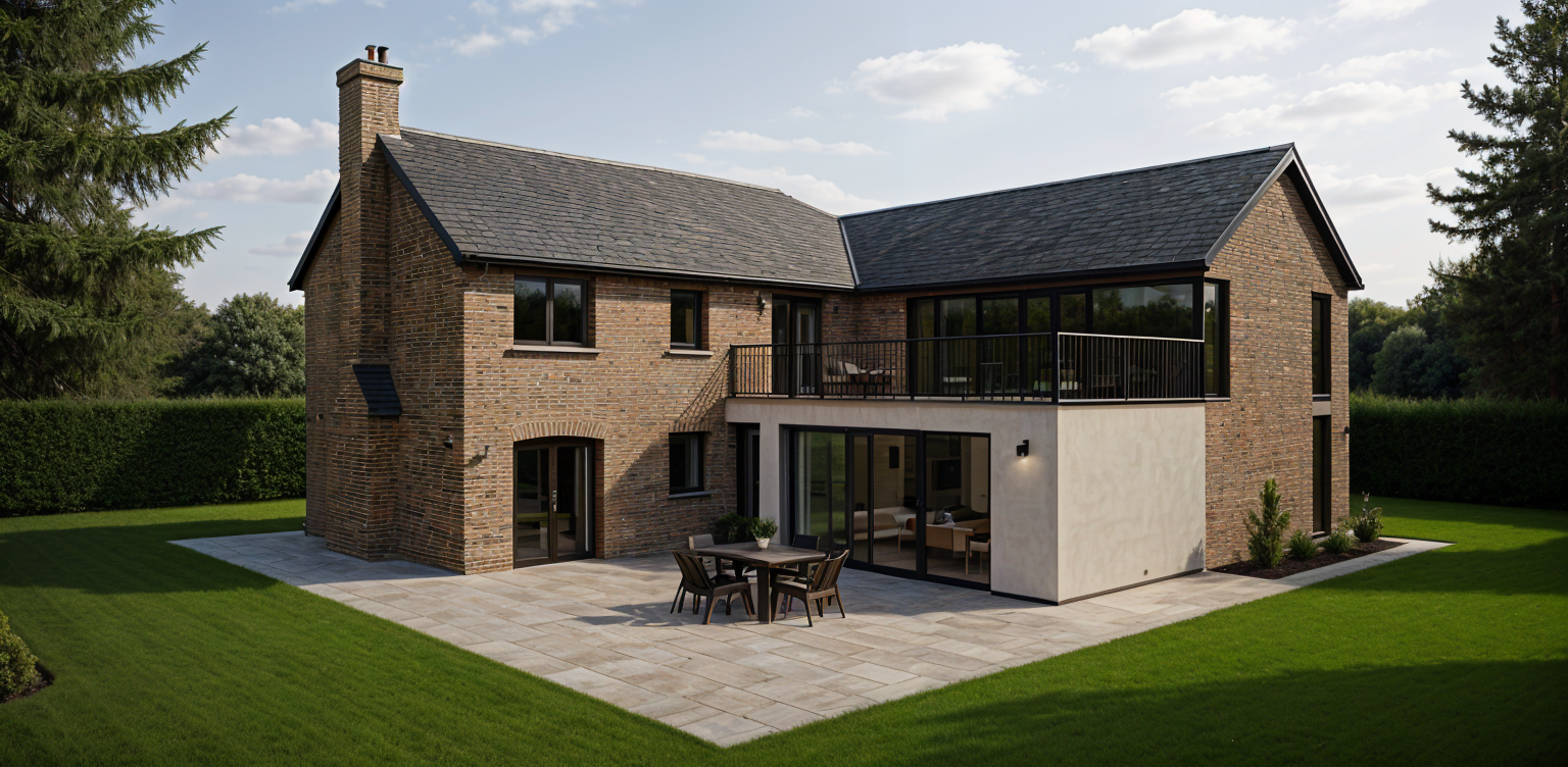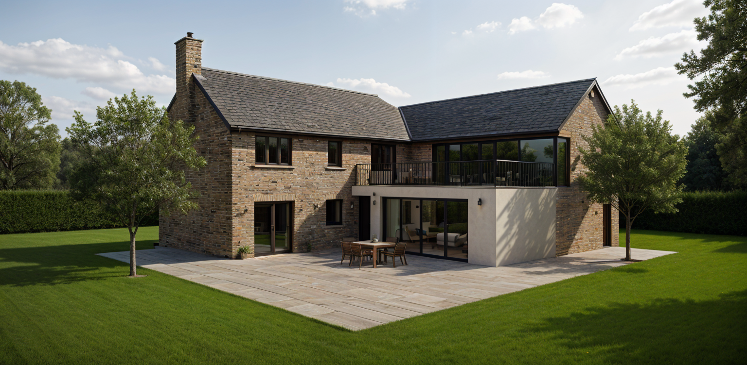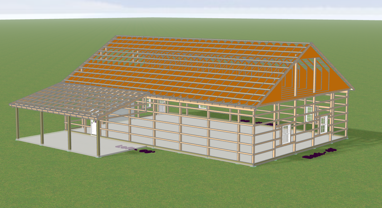 a modern barn structure in progress on a vibrant green grass field featuring a skeleton frame of wooden beams add a clear blue sky with light fluffy clouds the atmosphere is serene and peaceful capturing the quiet beauty of rural architecture focus on natural lighting to enhance the textures and colors of the materials used architecture