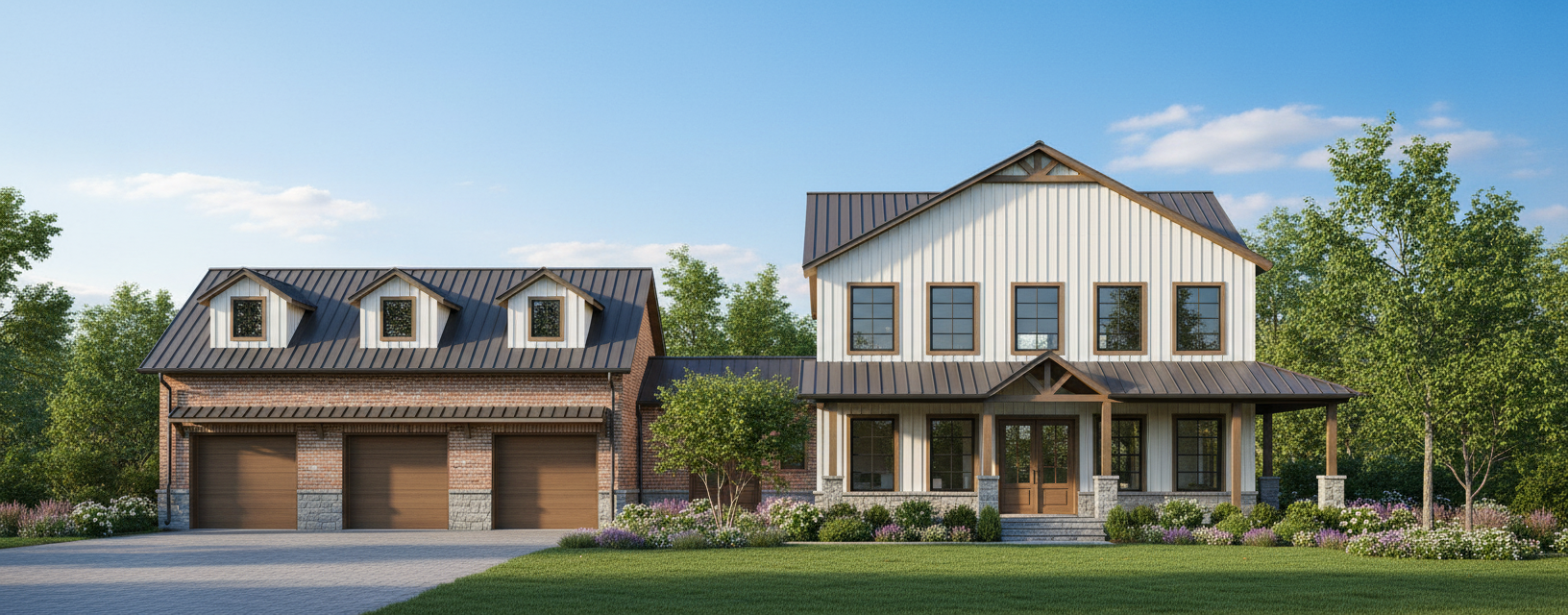 create a realistic and visually stunning rendering of a modern farmhouse design the house features a large main building with a simple two story structure and an attached three car garage with pyramid shaped dormer windows the exterior is clad in sleek vertical metal siding that is bright white highlight the windows and trim with crisp black accents to contrast the light siding the roof is made of metal and colored in a dark charcoal gray harmonizing with the overall aesthetic the front entryway features a set of elegant wooden double doors painted in a rich mahogany tone the atmosphere is serene and inviting set during the golden hour casting a warm glow over the property with soft ambient lighting illuminating the architectural details