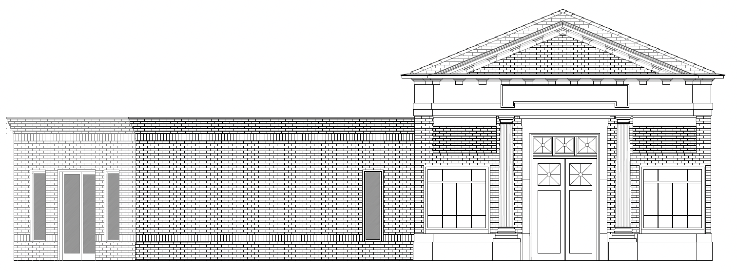 brick building with stucco entablature frosted windows on left addition